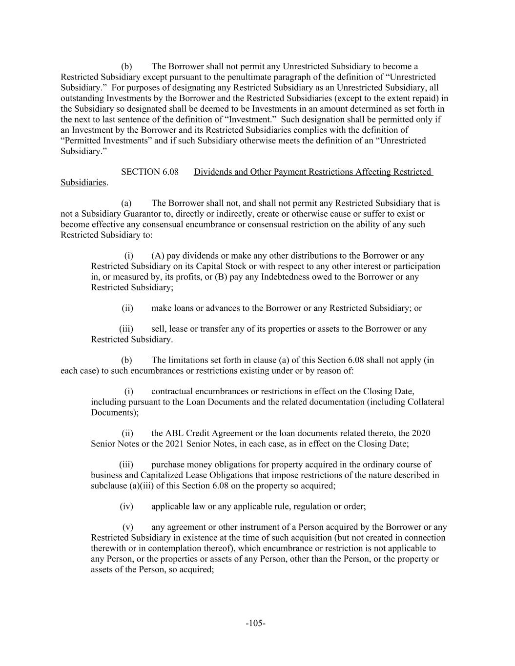 The Borrower shall not permit any Unrestricted Subsidiary to become a(b) Restricted Subsidiary except pursuant to the penultimate paragraph of the definition of “Unrestricted Subsidiary.” For purposes of designating any Restricted Subsidiary as an Unrestricted Subsidiary, all outstanding Investments by the Borrower and the Restricted Subsidiaries (except to the extent repaid) in the Subsidiary so designated shall be deemed to be Investments in an amount determined as set forth in the next to last sentence of the definition of “Investment.” Such designation shall be permitted only if an Investment by the Borrower and its Restricted Subsidiaries complies with the definition of “Permitted Investments” and if such Subsidiary otherwise meets the definition of an “Unrestricted Subsidiary.” Dividends and Other Payment Restrictions Affecting Restricted SECTION 6.08 Subsidiaries. The Borrower shall not, and shall not permit any Restricted Subsidiary that is(a) not a Subsidiary Guarantor to, directly or indirectly, create or otherwise cause or suffer to exist or become effective any consensual encumbrance or consensual restriction on the ability of any such Restricted Subsidiary to: (A) pay dividends or make any other distributions to the Borrower or any(i) Restricted Subsidiary on its Capital Stock or with respect to any other interest or participation in, or measured by, its profits, or (B) pay any Indebtedness owed to the Borrower or any Restricted Subsidiary; make loans or advances to the Borrower or any Restricted Subsidiary; or(ii) sell, lease or transfer any of its properties or assets to the Borrower or any(iii) Restricted Subsidiary. The limitations set forth in clause (a) of this Section 6.08 shall not apply (in(b) each case) to such encumbrances or restrictions existing under or by reason of: contractual encumbrances or restrictions in effect on the Closing Date,(i) including pursuant to the Loan Documents and the related documentation (including Collateral Documents); the ABL Credit Agreement or the loan documents related thereto, the 2020(ii) Senior Notes or the 2021 Senior Notes, in each case, as in effect on the Closing Date; purchase money obligations for property acquired in the ordinary course of(iii) business and Capitalized Lease Obligations that impose restrictions of the nature described in subclause (a)(iii) of this Section 6.08 on the property so acquired; applicable law or any applicable rule, regulation or order;(iv) any agreement or other instrument of a Person acquired by the Borrower or any(v) Restricted Subsidiary in existence at the time of such acquisition (but not created in connection therewith or in contemplation thereof), which encumbrance or restriction is not applicable to any Person, or the properties or assets of any Person, other than the Person, or the property or assets of the Person, so acquired; -105-