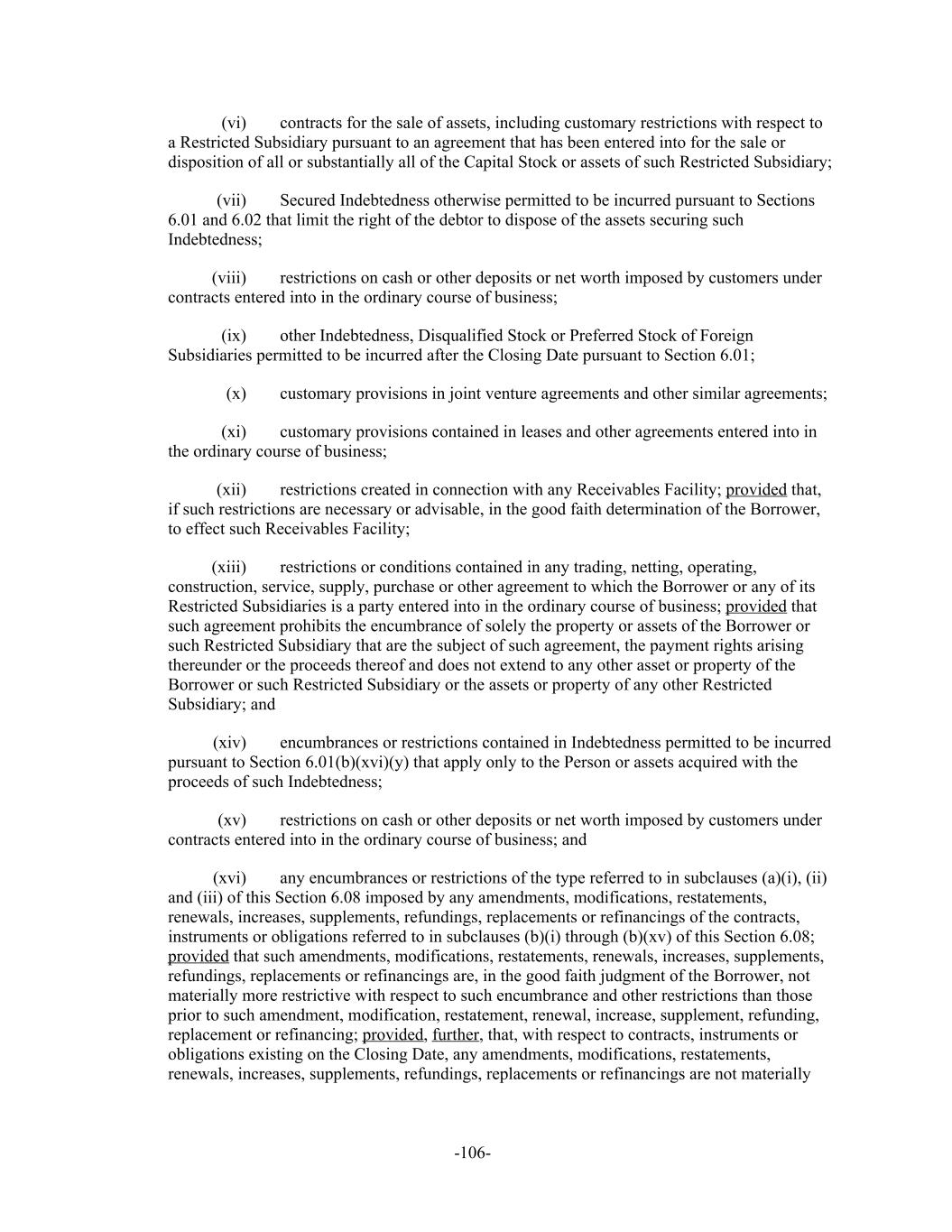 contracts for the sale of assets, including customary restrictions with respect to(vi) a Restricted Subsidiary pursuant to an agreement that has been entered into for the sale or disposition of all or substantially all of the Capital Stock or assets of such Restricted Subsidiary; Secured Indebtedness otherwise permitted to be incurred pursuant to Sections(vii) 6.01 and 6.02 that limit the right of the debtor to dispose of the assets securing such Indebtedness; restrictions on cash or other deposits or net worth imposed by customers under(viii) contracts entered into in the ordinary course of business; other Indebtedness, Disqualified Stock or Preferred Stock of Foreign(ix) Subsidiaries permitted to be incurred after the Closing Date pursuant to Section 6.01; customary provisions in joint venture agreements and other similar agreements;(x) customary provisions contained in leases and other agreements entered into in(xi) the ordinary course of business; restrictions created in connection with any Receivables Facility; provided that,(xii) if such restrictions are necessary or advisable, in the good faith determination of the Borrower, to effect such Receivables Facility; restrictions or conditions contained in any trading, netting, operating,(xiii) construction, service, supply, purchase or other agreement to which the Borrower or any of its Restricted Subsidiaries is a party entered into in the ordinary course of business; provided that such agreement prohibits the encumbrance of solely the property or assets of the Borrower or such Restricted Subsidiary that are the subject of such agreement, the payment rights arising thereunder or the proceeds thereof and does not extend to any other asset or property of the Borrower or such Restricted Subsidiary or the assets or property of any other Restricted Subsidiary; and encumbrances or restrictions contained in Indebtedness permitted to be incurred(xiv) pursuant to Section 6.01(b)(xvi)(y) that apply only to the Person or assets acquired with the proceeds of such Indebtedness; restrictions on cash or other deposits or net worth imposed by customers under(xv) contracts entered into in the ordinary course of business; and any encumbrances or restrictions of the type referred to in subclauses (a)(i), (ii)(xvi) and (iii) of this Section 6.08 imposed by any amendments, modifications, restatements, renewals, increases, supplements, refundings, replacements or refinancings of the contracts, instruments or obligations referred to in subclauses (b)(i) through (b)(xv) of this Section 6.08; provided that such amendments, modifications, restatements, renewals, increases, supplements, refundings, replacements or refinancings are, in the good faith judgment of the Borrower, not materially more restrictive with respect to such encumbrance and other restrictions than those prior to such amendment, modification, restatement, renewal, increase, supplement, refunding, replacement or refinancing; provided, further, that, with respect to contracts, instruments or obligations existing on the Closing Date, any amendments, modifications, restatements, renewals, increases, supplements, refundings, replacements or refinancings are not materially -106-