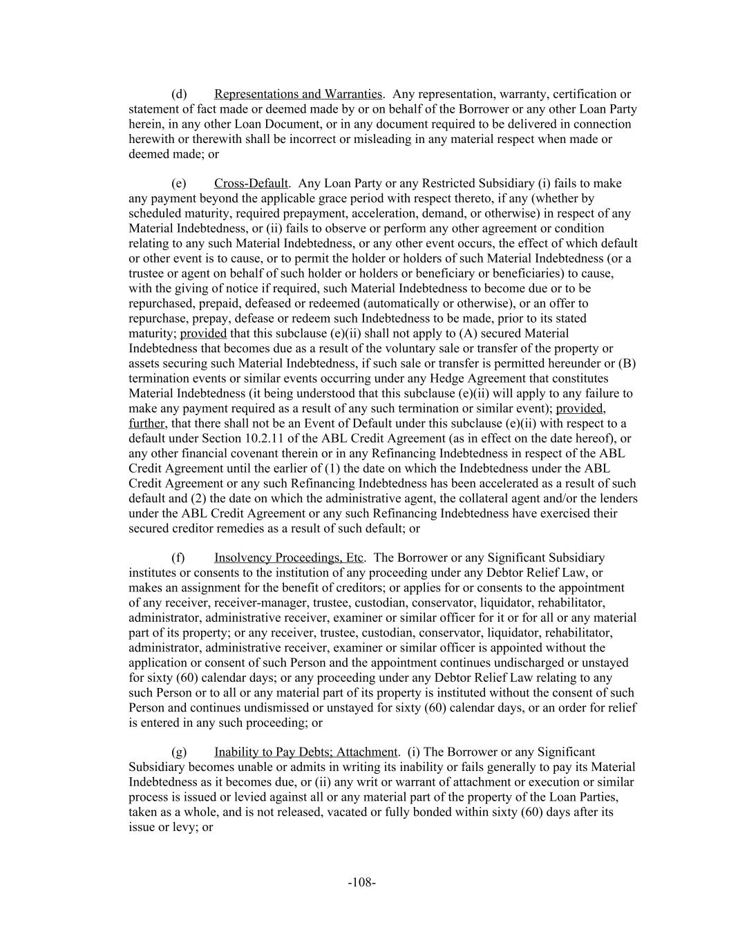 (d) Representations and Warranties. Any representation, warranty, certification or statement of fact made or deemed made by or on behalf of the Borrower or any other Loan Party herein, in any other Loan Document, or in any document required to be delivered in connection herewith or therewith shall be incorrect or misleading in any material respect when made or deemed made; or (e) Cross-Default. Any Loan Party or any Restricted Subsidiary (i) fails to make any payment beyond the applicable grace period with respect thereto, if any (whether by scheduled maturity, required prepayment, acceleration, demand, or otherwise) in respect of any Material Indebtedness, or (ii) fails to observe or perform any other agreement or condition relating to any such Material Indebtedness, or any other event occurs, the effect of which default or other event is to cause, or to permit the holder or holders of such Material Indebtedness (or a trustee or agent on behalf of such holder or holders or beneficiary or beneficiaries) to cause, with the giving of notice if required, such Material Indebtedness to become due or to be repurchased, prepaid, defeased or redeemed (automatically or otherwise), or an offer to repurchase, prepay, defease or redeem such Indebtedness to be made, prior to its stated maturity; provided that this subclause (e)(ii) shall not apply to (A) secured Material Indebtedness that becomes due as a result of the voluntary sale or transfer of the property or assets securing such Material Indebtedness, if such sale or transfer is permitted hereunder or (B) termination events or similar events occurring under any Hedge Agreement that constitutes Material Indebtedness (it being understood that this subclause (e)(ii) will apply to any failure to make any payment required as a result of any such termination or similar event); provided, further, that there shall not be an Event of Default under this subclause (e)(ii) with respect to a default under Section 10.2.11 of the ABL Credit Agreement (as in effect on the date hereof), or any other financial covenant therein or in any Refinancing Indebtedness in respect of the ABL Credit Agreement until the earlier of (1) the date on which the Indebtedness under the ABL Credit Agreement or any such Refinancing Indebtedness has been accelerated as a result of such default and (2) the date on which the administrative agent, the collateral agent and/or the lenders under the ABL Credit Agreement or any such Refinancing Indebtedness have exercised their secured creditor remedies as a result of such default; or (f) Insolvency Proceedings, Etc. The Borrower or any Significant Subsidiary institutes or consents to the institution of any proceeding under any Debtor Relief Law, or makes an assignment for the benefit of creditors; or applies for or consents to the appointment of any receiver, receiver-manager, trustee, custodian, conservator, liquidator, rehabilitator, administrator, administrative receiver, examiner or similar officer for it or for all or any material part of its property; or any receiver, trustee, custodian, conservator, liquidator, rehabilitator, administrator, administrative receiver, examiner or similar officer is appointed without the application or consent of such Person and the appointment continues undischarged or unstayed for sixty (60) calendar days; or any proceeding under any Debtor Relief Law relating to any such Person or to all or any material part of its property is instituted without the consent of such Person and continues undismissed or unstayed for sixty (60) calendar days, or an order for relief is entered in any such proceeding; or (g) Inability to Pay Debts; Attachment. (i) The Borrower or any Significant Subsidiary becomes unable or admits in writing its inability or fails generally to pay its Material Indebtedness as it becomes due, or (ii) any writ or warrant of attachment or execution or similar process is issued or levied against all or any material part of the property of the Loan Parties, taken as a whole, and is not released, vacated or fully bonded within sixty (60) days after its issue or levy; or -108-