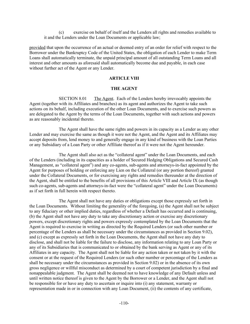 (c) exercise on behalf of itself and the Lenders all rights and remedies available to it and the Lenders under the Loan Documents or applicable law; provided that upon the occurrence of an actual or deemed entry of an order for relief with respect to the Borrower under the Bankruptcy Code of the United States, the obligation of each Lender to make Term Loans shall automatically terminate, the unpaid principal amount of all outstanding Term Loans and all interest and other amounts as aforesaid shall automatically become due and payable, in each case without further act of the Agent or any Lender. ARTICLE VIII THE AGENT The Agent. Each of the Lenders hereby irrevocably appoints theSECTION 8.01 Agent (together with its Affiliates and branches) as its agent and authorizes the Agent to take such actions on its behalf, including execution of the other Loan Documents, and to exercise such powers as are delegated to the Agent by the terms of the Loan Documents, together with such actions and powers as are reasonably incidental thereto. The Agent shall have the same rights and powers in its capacity as a Lender as any other Lender and may exercise the same as though it were not the Agent, and the Agent and its Affiliates may accept deposits from, lend money to and generally engage in any kind of business with the Loan Parties or any Subsidiary of a Loan Party or other Affiliate thereof as if it were not the Agent hereunder. The Agent shall also act as the “collateral agent” under the Loan Documents, and each of the Lenders (including in its capacities as a holder of Secured Hedging Obligations and Secured Cash Management, as “collateral agent”) and any co-agents, sub-agents and attorneys-in-fact appointed by the Agent for purposes of holding or enforcing any Lien on the Collateral (or any portion thereof) granted under the Collateral Documents, or for exercising any rights and remedies thereunder at the direction of the Agent, shall be entitled to the benefits of all provisions of this Article VIII and Article IX (as though such co-agents, sub-agents and attorneys-in-fact were the “collateral agent” under the Loan Documents) as if set forth in full herein with respect thereto. The Agent shall not have any duties or obligations except those expressly set forth in the Loan Documents. Without limiting the generality of the foregoing, (a) the Agent shall not be subject to any fiduciary or other implied duties, regardless of whether a Default has occurred and is continuing, (b) the Agent shall not have any duty to take any discretionary action or exercise any discretionary powers, except discretionary rights and powers expressly contemplated by the Loan Documents that the Agent is required to exercise in writing as directed by the Required Lenders (or such other number or percentage of the Lenders as shall be necessary under the circumstances as provided in Section 9.02), and (c) except as expressly set forth in the Loan Documents, the Agent shall not have any duty to disclose, and shall not be liable for the failure to disclose, any information relating to any Loan Party or any of its Subsidiaries that is communicated to or obtained by the bank serving as Agent or any of its Affiliates in any capacity. The Agent shall not be liable for any action taken or not taken by it with the consent or at the request of the Required Lenders (or such other number or percentage of the Lenders as shall be necessary under the circumstances as provided in Section 9.02) or in the absence of its own gross negligence or willful misconduct as determined by a court of competent jurisdiction by a final and nonappealable judgment. The Agent shall be deemed not to have knowledge of any Default unless and until written notice thereof is given to the Agent by the Borrower or a Lender, and the Agent shall not be responsible for or have any duty to ascertain or inquire into (i) any statement, warranty or representation made in or in connection with any Loan Document, (ii) the contents of any certificate, -110-