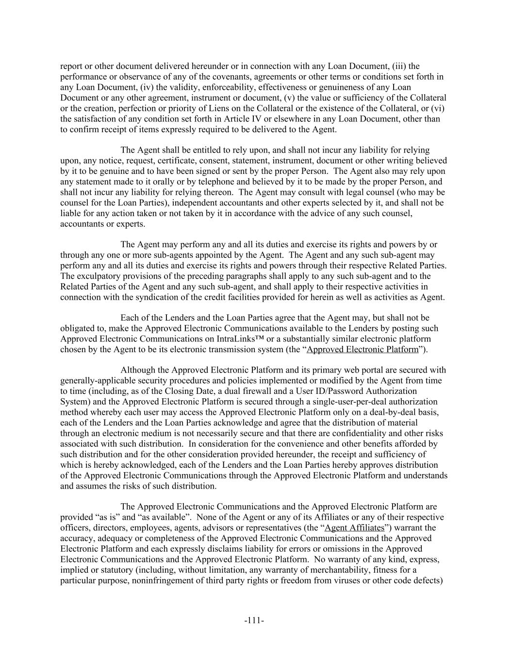 report or other document delivered hereunder or in connection with any Loan Document, (iii) the performance or observance of any of the covenants, agreements or other terms or conditions set forth in any Loan Document, (iv) the validity, enforceability, effectiveness or genuineness of any Loan Document or any other agreement, instrument or document, (v) the value or sufficiency of the Collateral or the creation, perfection or priority of Liens on the Collateral or the existence of the Collateral, or (vi) the satisfaction of any condition set forth in Article IV or elsewhere in any Loan Document, other than to confirm receipt of items expressly required to be delivered to the Agent. The Agent shall be entitled to rely upon, and shall not incur any liability for relying upon, any notice, request, certificate, consent, statement, instrument, document or other writing believed by it to be genuine and to have been signed or sent by the proper Person. The Agent also may rely upon any statement made to it orally or by telephone and believed by it to be made by the proper Person, and shall not incur any liability for relying thereon. The Agent may consult with legal counsel (who may be counsel for the Loan Parties), independent accountants and other experts selected by it, and shall not be liable for any action taken or not taken by it in accordance with the advice of any such counsel, accountants or experts. The Agent may perform any and all its duties and exercise its rights and powers by or through any one or more sub-agents appointed by the Agent. The Agent and any such sub-agent may perform any and all its duties and exercise its rights and powers through their respective Related Parties. The exculpatory provisions of the preceding paragraphs shall apply to any such sub-agent and to the Related Parties of the Agent and any such sub-agent, and shall apply to their respective activities in connection with the syndication of the credit facilities provided for herein as well as activities as Agent. Each of the Lenders and the Loan Parties agree that the Agent may, but shall not be obligated to, make the Approved Electronic Communications available to the Lenders by posting such Approved Electronic Communications on IntraLinks™ or a substantially similar electronic platform chosen by the Agent to be its electronic transmission system (the “Approved Electronic Platform”). Although the Approved Electronic Platform and its primary web portal are secured with generally-applicable security procedures and policies implemented or modified by the Agent from time to time (including, as of the Closing Date, a dual firewall and a User ID/Password Authorization System) and the Approved Electronic Platform is secured through a single-user-per-deal authorization method whereby each user may access the Approved Electronic Platform only on a deal-by-deal basis, each of the Lenders and the Loan Parties acknowledge and agree that the distribution of material through an electronic medium is not necessarily secure and that there are confidentiality and other risks associated with such distribution. In consideration for the convenience and other benefits afforded by such distribution and for the other consideration provided hereunder, the receipt and sufficiency of which is hereby acknowledged, each of the Lenders and the Loan Parties hereby approves distribution of the Approved Electronic Communications through the Approved Electronic Platform and understands and assumes the risks of such distribution. The Approved Electronic Communications and the Approved Electronic Platform are provided “as is” and “as available”. None of the Agent or any of its Affiliates or any of their respective officers, directors, employees, agents, advisors or representatives (the “Agent Affiliates”) warrant the accuracy, adequacy or completeness of the Approved Electronic Communications and the Approved Electronic Platform and each expressly disclaims liability for errors or omissions in the Approved Electronic Communications and the Approved Electronic Platform. No warranty of any kind, express, implied or statutory (including, without limitation, any warranty of merchantability, fitness for a particular purpose, noninfringement of third party rights or freedom from viruses or other code defects) -111-