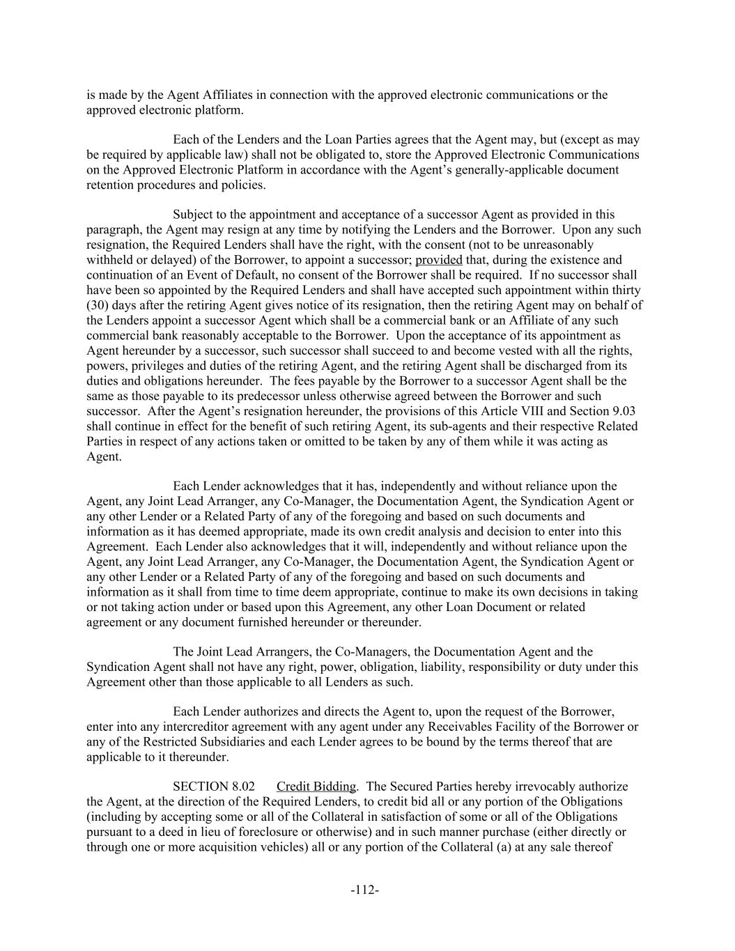 is made by the Agent Affiliates in connection with the approved electronic communications or the approved electronic platform. Each of the Lenders and the Loan Parties agrees that the Agent may, but (except as may be required by applicable law) shall not be obligated to, store the Approved Electronic Communications on the Approved Electronic Platform in accordance with the Agent’s generally-applicable document retention procedures and policies. Subject to the appointment and acceptance of a successor Agent as provided in this paragraph, the Agent may resign at any time by notifying the Lenders and the Borrower. Upon any such resignation, the Required Lenders shall have the right, with the consent (not to be unreasonably withheld or delayed) of the Borrower, to appoint a successor; provided that, during the existence and continuation of an Event of Default, no consent of the Borrower shall be required. If no successor shall have been so appointed by the Required Lenders and shall have accepted such appointment within thirty (30) days after the retiring Agent gives notice of its resignation, then the retiring Agent may on behalf of the Lenders appoint a successor Agent which shall be a commercial bank or an Affiliate of any such commercial bank reasonably acceptable to the Borrower. Upon the acceptance of its appointment as Agent hereunder by a successor, such successor shall succeed to and become vested with all the rights, powers, privileges and duties of the retiring Agent, and the retiring Agent shall be discharged from its duties and obligations hereunder. The fees payable by the Borrower to a successor Agent shall be the same as those payable to its predecessor unless otherwise agreed between the Borrower and such successor. After the Agent’s resignation hereunder, the provisions of this Article VIII and Section 9.03 shall continue in effect for the benefit of such retiring Agent, its sub-agents and their respective Related Parties in respect of any actions taken or omitted to be taken by any of them while it was acting as Agent. Each Lender acknowledges that it has, independently and without reliance upon the Agent, any Joint Lead Arranger, any Co-Manager, the Documentation Agent, the Syndication Agent or any other Lender or a Related Party of any of the foregoing and based on such documents and information as it has deemed appropriate, made its own credit analysis and decision to enter into this Agreement. Each Lender also acknowledges that it will, independently and without reliance upon the Agent, any Joint Lead Arranger, any Co-Manager, the Documentation Agent, the Syndication Agent or any other Lender or a Related Party of any of the foregoing and based on such documents and information as it shall from time to time deem appropriate, continue to make its own decisions in taking or not taking action under or based upon this Agreement, any other Loan Document or related agreement or any document furnished hereunder or thereunder. The Joint Lead Arrangers, the Co-Managers, the Documentation Agent and the Syndication Agent shall not have any right, power, obligation, liability, responsibility or duty under this Agreement other than those applicable to all Lenders as such. Each Lender authorizes and directs the Agent to, upon the request of the Borrower, enter into any intercreditor agreement with any agent under any Receivables Facility of the Borrower or any of the Restricted Subsidiaries and each Lender agrees to be bound by the terms thereof that are applicable to it thereunder. Credit Bidding. The Secured Parties hereby irrevocably authorizeSECTION 8.02 the Agent, at the direction of the Required Lenders, to credit bid all or any portion of the Obligations (including by accepting some or all of the Collateral in satisfaction of some or all of the Obligations pursuant to a deed in lieu of foreclosure or otherwise) and in such manner purchase (either directly or through one or more acquisition vehicles) all or any portion of the Collateral (a) at any sale thereof -112-