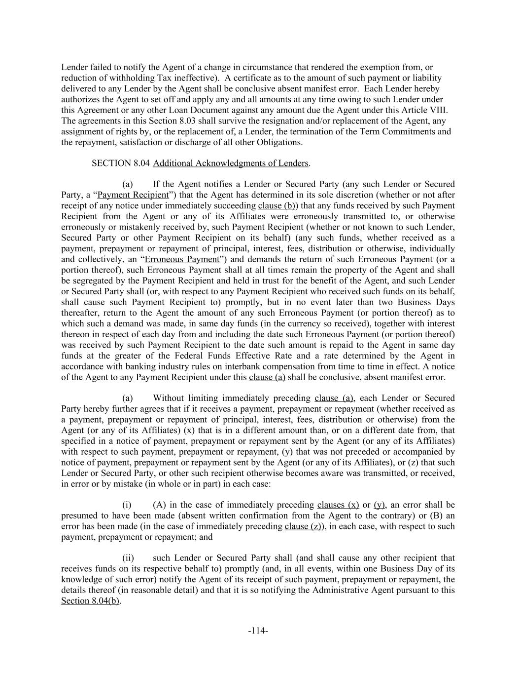 Lender failed to notify the Agent of a change in circumstance that rendered the exemption from, or reduction of withholding Tax ineffective). A certificate as to the amount of such payment or liability delivered to any Lender by the Agent shall be conclusive absent manifest error. Each Lender hereby authorizes the Agent to set off and apply any and all amounts at any time owing to such Lender under this Agreement or any other Loan Document against any amount due the Agent under this Article VIII. The agreements in this Section 8.03 shall survive the resignation and/or replacement of the Agent, any assignment of rights by, or the replacement of, a Lender, the termination of the Term Commitments and the repayment, satisfaction or discharge of all other Obligations. Additional Acknowledgments of Lenders.SECTION 8.04 If the Agent notifies a Lender or Secured Party (any such Lender or Secured(a) Party, a “Payment Recipient”) that the Agent has determined in its sole discretion (whether or not after receipt of any notice under immediately succeeding clause (b)) that any funds received by such Payment Recipient from the Agent or any of its Affiliates were erroneously transmitted to, or otherwise erroneously or mistakenly received by, such Payment Recipient (whether or not known to such Lender, Secured Party or other Payment Recipient on its behalf) (any such funds, whether received as a payment, prepayment or repayment of principal, interest, fees, distribution or otherwise, individually and collectively, an “Erroneous Payment”) and demands the return of such Erroneous Payment (or a portion thereof), such Erroneous Payment shall at all times remain the property of the Agent and shall be segregated by the Payment Recipient and held in trust for the benefit of the Agent, and such Lender or Secured Party shall (or, with respect to any Payment Recipient who received such funds on its behalf, shall cause such Payment Recipient to) promptly, but in no event later than two Business Days thereafter, return to the Agent the amount of any such Erroneous Payment (or portion thereof) as to which such a demand was made, in same day funds (in the currency so received), together with interest thereon in respect of each day from and including the date such Erroneous Payment (or portion thereof) was received by such Payment Recipient to the date such amount is repaid to the Agent in same day funds at the greater of the Federal Funds Effective Rate and a rate determined by the Agent in accordance with banking industry rules on interbank compensation from time to time in effect. A notice of the Agent to any Payment Recipient under this clause (a) shall be conclusive, absent manifest error. Without limiting immediately preceding clause (a), each Lender or Secured(a) Party hereby further agrees that if it receives a payment, prepayment or repayment (whether received as a payment, prepayment or repayment of principal, interest, fees, distribution or otherwise) from the Agent (or any of its Affiliates) (x) that is in a different amount than, or on a different date from, that specified in a notice of payment, prepayment or repayment sent by the Agent (or any of its Affiliates) with respect to such payment, prepayment or repayment, (y) that was not preceded or accompanied by notice of payment, prepayment or repayment sent by the Agent (or any of its Affiliates), or (z) that such Lender or Secured Party, or other such recipient otherwise becomes aware was transmitted, or received, in error or by mistake (in whole or in part) in each case: (A) in the case of immediately preceding clauses (x) or (y), an error shall be(i) presumed to have been made (absent written confirmation from the Agent to the contrary) or (B) an error has been made (in the case of immediately preceding clause (z)), in each case, with respect to such payment, prepayment or repayment; and such Lender or Secured Party shall (and shall cause any other recipient that(ii) receives funds on its respective behalf to) promptly (and, in all events, within one Business Day of its knowledge of such error) notify the Agent of its receipt of such payment, prepayment or repayment, the details thereof (in reasonable detail) and that it is so notifying the Administrative Agent pursuant to this Section 8.04(b). -114-