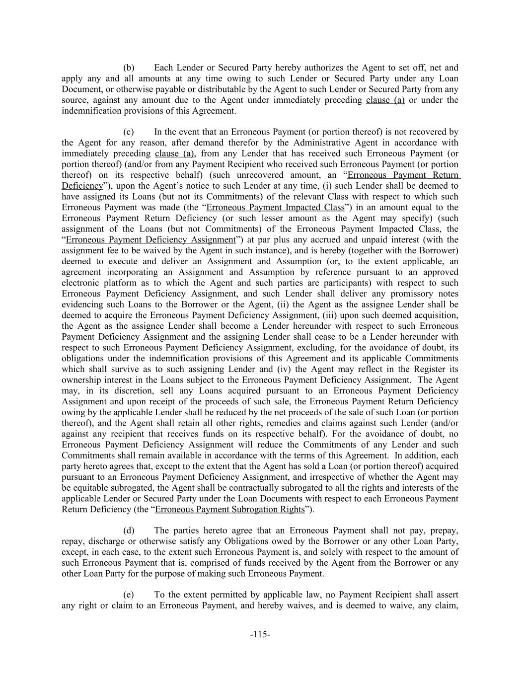 Each Lender or Secured Party hereby authorizes the Agent to set off, net and(b) apply any and all amounts at any time owing to such Lender or Secured Party under any Loan Document, or otherwise payable or distributable by the Agent to such Lender or Secured Party from any source, against any amount due to the Agent under immediately preceding clause (a) or under the indemnification provisions of this Agreement. In the event that an Erroneous Payment (or portion thereof) is not recovered by(c) the Agent for any reason, after demand therefor by the Administrative Agent in accordance with immediately preceding clause (a), from any Lender that has received such Erroneous Payment (or portion thereof) (and/or from any Payment Recipient who received such Erroneous Payment (or portion thereof) on its respective behalf) (such unrecovered amount, an “Erroneous Payment Return Deficiency”), upon the Agent’s notice to such Lender at any time, (i) such Lender shall be deemed to have assigned its Loans (but not its Commitments) of the relevant Class with respect to which such Erroneous Payment was made (the “Erroneous Payment Impacted Class”) in an amount equal to the Erroneous Payment Return Deficiency (or such lesser amount as the Agent may specify) (such assignment of the Loans (but not Commitments) of the Erroneous Payment Impacted Class, the “Erroneous Payment Deficiency Assignment”) at par plus any accrued and unpaid interest (with the assignment fee to be waived by the Agent in such instance), and is hereby (together with the Borrower) deemed to execute and deliver an Assignment and Assumption (or, to the extent applicable, an agreement incorporating an Assignment and Assumption by reference pursuant to an approved electronic platform as to which the Agent and such parties are participants) with respect to such Erroneous Payment Deficiency Assignment, and such Lender shall deliver any promissory notes evidencing such Loans to the Borrower or the Agent, (ii) the Agent as the assignee Lender shall be deemed to acquire the Erroneous Payment Deficiency Assignment, (iii) upon such deemed acquisition, the Agent as the assignee Lender shall become a Lender hereunder with respect to such Erroneous Payment Deficiency Assignment and the assigning Lender shall cease to be a Lender hereunder with respect to such Erroneous Payment Deficiency Assignment, excluding, for the avoidance of doubt, its obligations under the indemnification provisions of this Agreement and its applicable Commitments which shall survive as to such assigning Lender and (iv) the Agent may reflect in the Register its ownership interest in the Loans subject to the Erroneous Payment Deficiency Assignment. The Agent may, in its discretion, sell any Loans acquired pursuant to an Erroneous Payment Deficiency Assignment and upon receipt of the proceeds of such sale, the Erroneous Payment Return Deficiency owing by the applicable Lender shall be reduced by the net proceeds of the sale of such Loan (or portion thereof), and the Agent shall retain all other rights, remedies and claims against such Lender (and/or against any recipient that receives funds on its respective behalf). For the avoidance of doubt, no Erroneous Payment Deficiency Assignment will reduce the Commitments of any Lender and such Commitments shall remain available in accordance with the terms of this Agreement. In addition, each party hereto agrees that, except to the extent that the Agent has sold a Loan (or portion thereof) acquired pursuant to an Erroneous Payment Deficiency Assignment, and irrespective of whether the Agent may be equitable subrogated, the Agent shall be contractually subrogated to all the rights and interests of the applicable Lender or Secured Party under the Loan Documents with respect to each Erroneous Payment Return Deficiency (the “Erroneous Payment Subrogation Rights”). The parties hereto agree that an Erroneous Payment shall not pay, prepay,(d) repay, discharge or otherwise satisfy any Obligations owed by the Borrower or any other Loan Party, except, in each case, to the extent such Erroneous Payment is, and solely with respect to the amount of such Erroneous Payment that is, comprised of funds received by the Agent from the Borrower or any other Loan Party for the purpose of making such Erroneous Payment. To the extent permitted by applicable law, no Payment Recipient shall assert(e) any right or claim to an Erroneous Payment, and hereby waives, and is deemed to waive, any claim, -115-