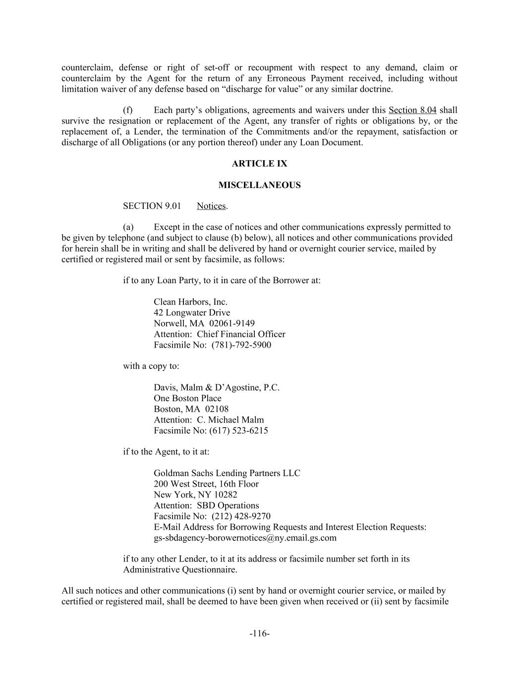 counterclaim, defense or right of set-off or recoupment with respect to any demand, claim or counterclaim by the Agent for the return of any Erroneous Payment received, including without limitation waiver of any defense based on “discharge for value” or any similar doctrine. Each party’s obligations, agreements and waivers under this Section 8.04 shall(f) survive the resignation or replacement of the Agent, any transfer of rights or obligations by, or the replacement of, a Lender, the termination of the Commitments and/or the repayment, satisfaction or discharge of all Obligations (or any portion thereof) under any Loan Document. ARTICLE IX MISCELLANEOUS Notices.SECTION 9.01 Except in the case of notices and other communications expressly permitted to(a) be given by telephone (and subject to clause (b) below), all notices and other communications provided for herein shall be in writing and shall be delivered by hand or overnight courier service, mailed by certified or registered mail or sent by facsimile, as follows: if to any Loan Party, to it in care of the Borrower at: Clean Harbors, Inc. 42 Longwater Drive Norwell, MA 02061-9149 Attention: Chief Financial Officer Facsimile No: (781)-792-5900 with a copy to: Davis, Malm & D’Agostine, P.C. One Boston Place Boston, MA 02108 Attention: C. Michael Malm Facsimile No: (617) 523-6215 if to the Agent, to it at: Goldman Sachs Lending Partners LLC 200 West Street, 16th Floor New York, NY 10282 Attention: SBD Operations Facsimile No: (212) 428-9270 E-Mail Address for Borrowing Requests and Interest Election Requests: gs-sbdagency-borowernotices@ny.email.gs.com if to any other Lender, to it at its address or facsimile number set forth in its Administrative Questionnaire. All such notices and other communications (i) sent by hand or overnight courier service, or mailed by certified or registered mail, shall be deemed to have been given when received or (ii) sent by facsimile -116-