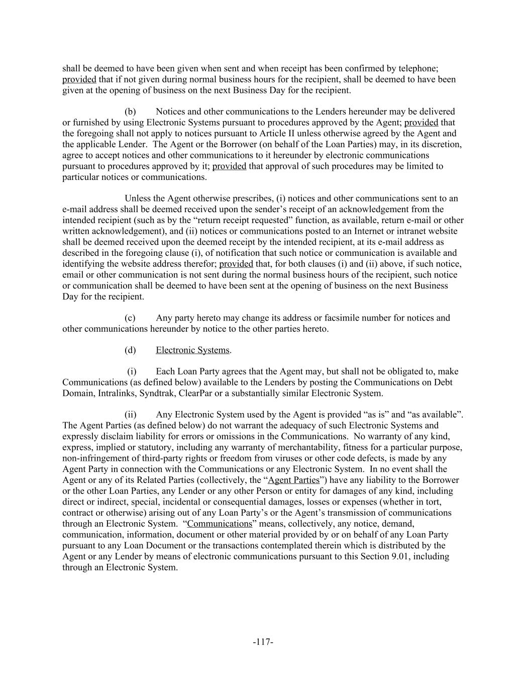 shall be deemed to have been given when sent and when receipt has been confirmed by telephone; provided that if not given during normal business hours for the recipient, shall be deemed to have been given at the opening of business on the next Business Day for the recipient. Notices and other communications to the Lenders hereunder may be delivered(b) or furnished by using Electronic Systems pursuant to procedures approved by the Agent; provided that the foregoing shall not apply to notices pursuant to Article II unless otherwise agreed by the Agent and the applicable Lender. The Agent or the Borrower (on behalf of the Loan Parties) may, in its discretion, agree to accept notices and other communications to it hereunder by electronic communications pursuant to procedures approved by it; provided that approval of such procedures may be limited to particular notices or communications. Unless the Agent otherwise prescribes, (i) notices and other communications sent to an e-mail address shall be deemed received upon the sender’s receipt of an acknowledgement from the intended recipient (such as by the “return receipt requested” function, as available, return e-mail or other written acknowledgement), and (ii) notices or communications posted to an Internet or intranet website shall be deemed received upon the deemed receipt by the intended recipient, at its e-mail address as described in the foregoing clause (i), of notification that such notice or communication is available and identifying the website address therefor; provided that, for both clauses (i) and (ii) above, if such notice, email or other communication is not sent during the normal business hours of the recipient, such notice or communication shall be deemed to have been sent at the opening of business on the next Business Day for the recipient. Any party hereto may change its address or facsimile number for notices and(c) other communications hereunder by notice to the other parties hereto. Electronic Systems.(d) (i) Each Loan Party agrees that the Agent may, but shall not be obligated to, make Communications (as defined below) available to the Lenders by posting the Communications on Debt Domain, Intralinks, Syndtrak, ClearPar or a substantially similar Electronic System. (ii) Any Electronic System used by the Agent is provided “as is” and “as available”. The Agent Parties (as defined below) do not warrant the adequacy of such Electronic Systems and expressly disclaim liability for errors or omissions in the Communications. No warranty of any kind, express, implied or statutory, including any warranty of merchantability, fitness for a particular purpose, non-infringement of third-party rights or freedom from viruses or other code defects, is made by any Agent Party in connection with the Communications or any Electronic System. In no event shall the Agent or any of its Related Parties (collectively, the “Agent Parties”) have any liability to the Borrower or the other Loan Parties, any Lender or any other Person or entity for damages of any kind, including direct or indirect, special, incidental or consequential damages, losses or expenses (whether in tort, contract or otherwise) arising out of any Loan Party’s or the Agent’s transmission of communications through an Electronic System. “Communications” means, collectively, any notice, demand, communication, information, document or other material provided by or on behalf of any Loan Party pursuant to any Loan Document or the transactions contemplated therein which is distributed by the Agent or any Lender by means of electronic communications pursuant to this Section 9.01, including through an Electronic System. -117-