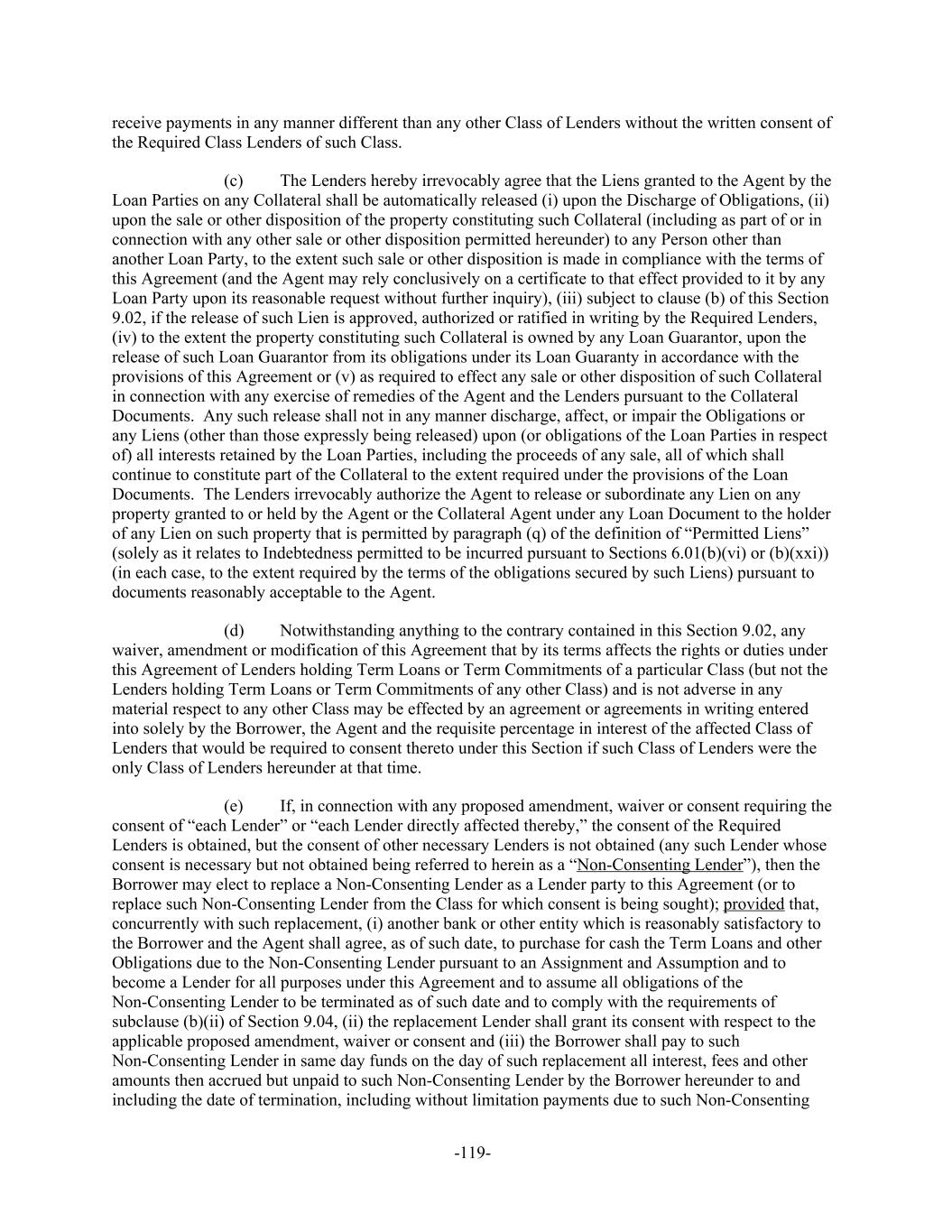 receive payments in any manner different than any other Class of Lenders without the written consent of the Required Class Lenders of such Class. The Lenders hereby irrevocably agree that the Liens granted to the Agent by the(c) Loan Parties on any Collateral shall be automatically released (i) upon the Discharge of Obligations, (ii) upon the sale or other disposition of the property constituting such Collateral (including as part of or in connection with any other sale or other disposition permitted hereunder) to any Person other than another Loan Party, to the extent such sale or other disposition is made in compliance with the terms of this Agreement (and the Agent may rely conclusively on a certificate to that effect provided to it by any Loan Party upon its reasonable request without further inquiry), (iii) subject to clause (b) of this Section 9.02, if the release of such Lien is approved, authorized or ratified in writing by the Required Lenders, (iv) to the extent the property constituting such Collateral is owned by any Loan Guarantor, upon the release of such Loan Guarantor from its obligations under its Loan Guaranty in accordance with the provisions of this Agreement or (v) as required to effect any sale or other disposition of such Collateral in connection with any exercise of remedies of the Agent and the Lenders pursuant to the Collateral Documents. Any such release shall not in any manner discharge, affect, or impair the Obligations or any Liens (other than those expressly being released) upon (or obligations of the Loan Parties in respect of) all interests retained by the Loan Parties, including the proceeds of any sale, all of which shall continue to constitute part of the Collateral to the extent required under the provisions of the Loan Documents. The Lenders irrevocably authorize the Agent to release or subordinate any Lien on any property granted to or held by the Agent or the Collateral Agent under any Loan Document to the holder of any Lien on such property that is permitted by paragraph (q) of the definition of “Permitted Liens” (solely as it relates to Indebtedness permitted to be incurred pursuant to Sections 6.01(b)(vi) or (b)(xxi)) (in each case, to the extent required by the terms of the obligations secured by such Liens) pursuant to documents reasonably acceptable to the Agent. Notwithstanding anything to the contrary contained in this Section 9.02, any(d) waiver, amendment or modification of this Agreement that by its terms affects the rights or duties under this Agreement of Lenders holding Term Loans or Term Commitments of a particular Class (but not the Lenders holding Term Loans or Term Commitments of any other Class) and is not adverse in any material respect to any other Class may be effected by an agreement or agreements in writing entered into solely by the Borrower, the Agent and the requisite percentage in interest of the affected Class of Lenders that would be required to consent thereto under this Section if such Class of Lenders were the only Class of Lenders hereunder at that time. If, in connection with any proposed amendment, waiver or consent requiring the(e) consent of “each Lender” or “each Lender directly affected thereby,” the consent of the Required Lenders is obtained, but the consent of other necessary Lenders is not obtained (any such Lender whose consent is necessary but not obtained being referred to herein as a “Non-Consenting Lender”), then the Borrower may elect to replace a Non-Consenting Lender as a Lender party to this Agreement (or to replace such Non-Consenting Lender from the Class for which consent is being sought); provided that, concurrently with such replacement, (i) another bank or other entity which is reasonably satisfactory to the Borrower and the Agent shall agree, as of such date, to purchase for cash the Term Loans and other Obligations due to the Non-Consenting Lender pursuant to an Assignment and Assumption and to become a Lender for all purposes under this Agreement and to assume all obligations of the Non-Consenting Lender to be terminated as of such date and to comply with the requirements of subclause (b)(ii) of Section 9.04, (ii) the replacement Lender shall grant its consent with respect to the applicable proposed amendment, waiver or consent and (iii) the Borrower shall pay to such Non-Consenting Lender in same day funds on the day of such replacement all interest, fees and other amounts then accrued but unpaid to such Non-Consenting Lender by the Borrower hereunder to and including the date of termination, including without limitation payments due to such Non-Consenting -119-