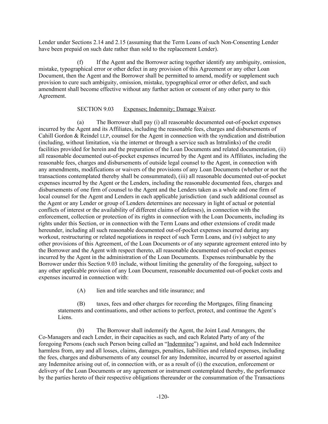 Lender under Sections 2.14 and 2.15 (assuming that the Term Loans of such Non-Consenting Lender have been prepaid on such date rather than sold to the replacement Lender). If the Agent and the Borrower acting together identify any ambiguity, omission,(f) mistake, typographical error or other defect in any provision of this Agreement or any other Loan Document, then the Agent and the Borrower shall be permitted to amend, modify or supplement such provision to cure such ambiguity, omission, mistake, typographical error or other defect, and such amendment shall become effective without any further action or consent of any other party to this Agreement. Expenses; Indemnity; Damage Waiver.SECTION 9.03 The Borrower shall pay (i) all reasonable documented out-of-pocket expenses(a) incurred by the Agent and its Affiliates, including the reasonable fees, charges and disbursements of Cahill Gordon & Reindel LLP, counsel for the Agent in connection with the syndication and distribution (including, without limitation, via the internet or through a service such as Intralinks) of the credit facilities provided for herein and the preparation of the Loan Documents and related documentation, (ii) all reasonable documented out-of-pocket expenses incurred by the Agent and its Affiliates, including the reasonable fees, charges and disbursements of outside legal counsel to the Agent, in connection with any amendments, modifications or waivers of the provisions of any Loan Documents (whether or not the transactions contemplated thereby shall be consummated), (iii) all reasonable documented out-of-pocket expenses incurred by the Agent or the Lenders, including the reasonable documented fees, charges and disbursements of one firm of counsel to the Agent and the Lenders taken as a whole and one firm of local counsel for the Agent and Lenders in each applicable jurisdiction (and such additional counsel as the Agent or any Lender or group of Lenders determines are necessary in light of actual or potential conflicts of interest or the availability of different claims of defenses), in connection with the enforcement, collection or protection of its rights in connection with the Loan Documents, including its rights under this Section, or in connection with the Term Loans and other extensions of credit made hereunder, including all such reasonable documented out-of-pocket expenses incurred during any workout, restructuring or related negotiations in respect of such Term Loans, and (iv) subject to any other provisions of this Agreement, of the Loan Documents or of any separate agreement entered into by the Borrower and the Agent with respect thereto, all reasonable documented out-of-pocket expenses incurred by the Agent in the administration of the Loan Documents. Expenses reimbursable by the Borrower under this Section 9.03 include, without limiting the generality of the foregoing, subject to any other applicable provision of any Loan Document, reasonable documented out-of-pocket costs and expenses incurred in connection with: lien and title searches and title insurance; and(A) taxes, fees and other charges for recording the Mortgages, filing financing(B) statements and continuations, and other actions to perfect, protect, and continue the Agent’s Liens. The Borrower shall indemnify the Agent, the Joint Lead Arrangers, the(b) Co-Managers and each Lender, in their capacities as such, and each Related Party of any of the foregoing Persons (each such Person being called an “Indemnitee”) against, and hold each Indemnitee harmless from, any and all losses, claims, damages, penalties, liabilities and related expenses, including the fees, charges and disbursements of any counsel for any Indemnitee, incurred by or asserted against any Indemnitee arising out of, in connection with, or as a result of (i) the execution, enforcement or delivery of the Loan Documents or any agreement or instrument contemplated thereby, the performance by the parties hereto of their respective obligations thereunder or the consummation of the Transactions -120-