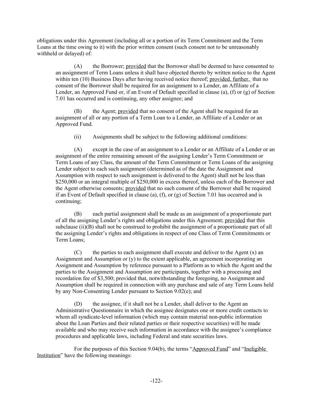 obligations under this Agreement (including all or a portion of its Term Commitment and the Term Loans at the time owing to it) with the prior written consent (such consent not to be unreasonably withheld or delayed) of: the Borrower; provided that the Borrower shall be deemed to have consented to(A) an assignment of Term Loans unless it shall have objected thereto by written notice to the Agent within ten (10) Business Days after having received notice thereof; provided, further, that no consent of the Borrower shall be required for an assignment to a Lender, an Affiliate of a Lender, an Approved Fund or, if an Event of Default specified in clause (a), (f) or (g) of Section 7.01 has occurred and is continuing, any other assignee; and the Agent; provided that no consent of the Agent shall be required for an(B) assignment of all or any portion of a Term Loan to a Lender, an Affiliate of a Lender or an Approved Fund. (ii) Assignments shall be subject to the following additional conditions: except in the case of an assignment to a Lender or an Affiliate of a Lender or an(A) assignment of the entire remaining amount of the assigning Lender’s Term Commitment or Term Loans of any Class, the amount of the Term Commitment or Term Loans of the assigning Lender subject to each such assignment (determined as of the date the Assignment and Assumption with respect to such assignment is delivered to the Agent) shall not be less than $250,000 or an integral multiple of $250,000 in excess thereof, unless each of the Borrower and the Agent otherwise consents; provided that no such consent of the Borrower shall be required if an Event of Default specified in clause (a), (f), or (g) of Section 7.01 has occurred and is continuing; each partial assignment shall be made as an assignment of a proportionate part(B) of all the assigning Lender’s rights and obligations under this Agreement; provided that this subclause (ii)(B) shall not be construed to prohibit the assignment of a proportionate part of all the assigning Lender’s rights and obligations in respect of one Class of Term Commitments or Term Loans; the parties to each assignment shall execute and deliver to the Agent (x) an(C) Assignment and Assumption or (y) to the extent applicable, an agreement incorporating an Assignment and Assumption by reference pursuant to a Platform as to which the Agent and the parties to the Assignment and Assumption are participants, together with a processing and recordation fee of $3,500; provided that, notwithstanding the foregoing, no Assignment and Assumption shall be required in connection with any purchase and sale of any Term Loans held by any Non-Consenting Lender pursuant to Section 9.02(e); and the assignee, if it shall not be a Lender, shall deliver to the Agent an(D) Administrative Questionnaire in which the assignee designates one or more credit contacts to whom all syndicate-level information (which may contain material non-public information about the Loan Parties and their related parties or their respective securities) will be made available and who may receive such information in accordance with the assignee’s compliance procedures and applicable laws, including Federal and state securities laws. For the purposes of this Section 9.04(b), the terms “Approved Fund” and “Ineligible Institution” have the following meanings: -122-