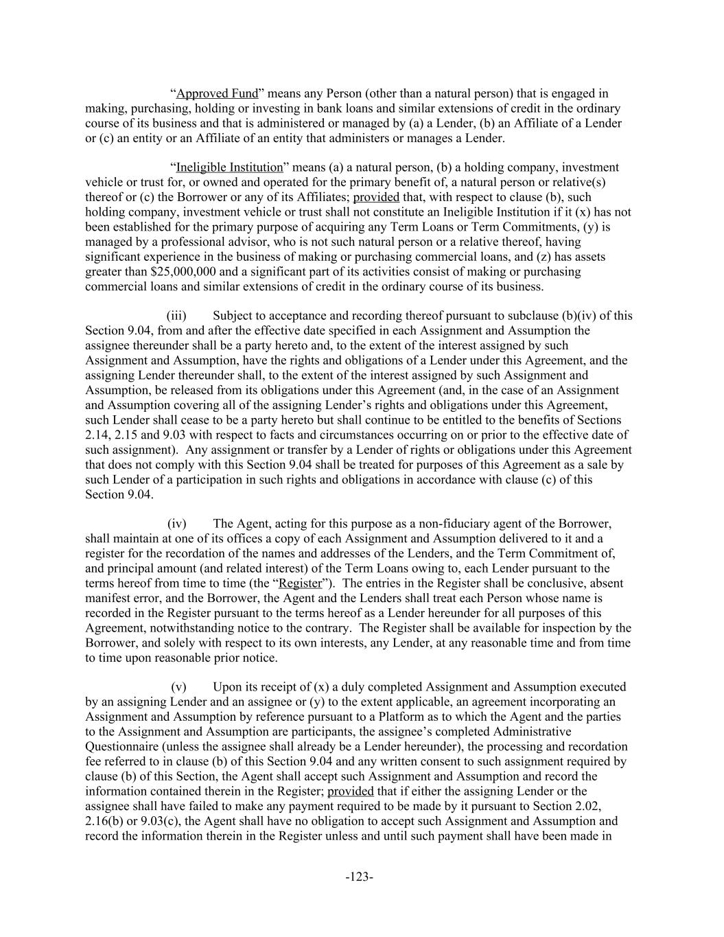 “Approved Fund” means any Person (other than a natural person) that is engaged in making, purchasing, holding or investing in bank loans and similar extensions of credit in the ordinary course of its business and that is administered or managed by (a) a Lender, (b) an Affiliate of a Lender or (c) an entity or an Affiliate of an entity that administers or manages a Lender. “Ineligible Institution” means (a) a natural person, (b) a holding company, investment vehicle or trust for, or owned and operated for the primary benefit of, a natural person or relative(s) thereof or (c) the Borrower or any of its Affiliates; provided that, with respect to clause (b), such holding company, investment vehicle or trust shall not constitute an Ineligible Institution if it (x) has not been established for the primary purpose of acquiring any Term Loans or Term Commitments, (y) is managed by a professional advisor, who is not such natural person or a relative thereof, having significant experience in the business of making or purchasing commercial loans, and (z) has assets greater than $25,000,000 and a significant part of its activities consist of making or purchasing commercial loans and similar extensions of credit in the ordinary course of its business. (iii) Subject to acceptance and recording thereof pursuant to subclause (b)(iv) of this Section 9.04, from and after the effective date specified in each Assignment and Assumption the assignee thereunder shall be a party hereto and, to the extent of the interest assigned by such Assignment and Assumption, have the rights and obligations of a Lender under this Agreement, and the assigning Lender thereunder shall, to the extent of the interest assigned by such Assignment and Assumption, be released from its obligations under this Agreement (and, in the case of an Assignment and Assumption covering all of the assigning Lender’s rights and obligations under this Agreement, such Lender shall cease to be a party hereto but shall continue to be entitled to the benefits of Sections 2.14, 2.15 and 9.03 with respect to facts and circumstances occurring on or prior to the effective date of such assignment). Any assignment or transfer by a Lender of rights or obligations under this Agreement that does not comply with this Section 9.04 shall be treated for purposes of this Agreement as a sale by such Lender of a participation in such rights and obligations in accordance with clause (c) of this Section 9.04. (iv) The Agent, acting for this purpose as a non-fiduciary agent of the Borrower, shall maintain at one of its offices a copy of each Assignment and Assumption delivered to it and a register for the recordation of the names and addresses of the Lenders, and the Term Commitment of, and principal amount (and related interest) of the Term Loans owing to, each Lender pursuant to the terms hereof from time to time (the “Register”). The entries in the Register shall be conclusive, absent manifest error, and the Borrower, the Agent and the Lenders shall treat each Person whose name is recorded in the Register pursuant to the terms hereof as a Lender hereunder for all purposes of this Agreement, notwithstanding notice to the contrary. The Register shall be available for inspection by the Borrower, and solely with respect to its own interests, any Lender, at any reasonable time and from time to time upon reasonable prior notice. (v) Upon its receipt of (x) a duly completed Assignment and Assumption executed by an assigning Lender and an assignee or (y) to the extent applicable, an agreement incorporating an Assignment and Assumption by reference pursuant to a Platform as to which the Agent and the parties to the Assignment and Assumption are participants, the assignee’s completed Administrative Questionnaire (unless the assignee shall already be a Lender hereunder), the processing and recordation fee referred to in clause (b) of this Section 9.04 and any written consent to such assignment required by clause (b) of this Section, the Agent shall accept such Assignment and Assumption and record the information contained therein in the Register; provided that if either the assigning Lender or the assignee shall have failed to make any payment required to be made by it pursuant to Section 2.02, 2.16(b) or 9.03(c), the Agent shall have no obligation to accept such Assignment and Assumption and record the information therein in the Register unless and until such payment shall have been made in -123-