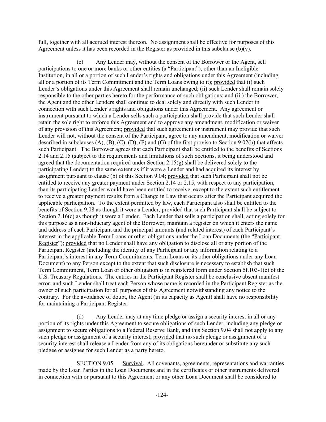 full, together with all accrued interest thereon. No assignment shall be effective for purposes of this Agreement unless it has been recorded in the Register as provided in this subclause (b)(v). Any Lender may, without the consent of the Borrower or the Agent, sell(c) participations to one or more banks or other entities (a “Participant”), other than an Ineligible Institution, in all or a portion of such Lender’s rights and obligations under this Agreement (including all or a portion of its Term Commitment and the Term Loans owing to it); provided that (i) such Lender’s obligations under this Agreement shall remain unchanged; (ii) such Lender shall remain solely responsible to the other parties hereto for the performance of such obligations; and (iii) the Borrower, the Agent and the other Lenders shall continue to deal solely and directly with such Lender in connection with such Lender’s rights and obligations under this Agreement. Any agreement or instrument pursuant to which a Lender sells such a participation shall provide that such Lender shall retain the sole right to enforce this Agreement and to approve any amendment, modification or waiver of any provision of this Agreement; provided that such agreement or instrument may provide that such Lender will not, without the consent of the Participant, agree to any amendment, modification or waiver described in subclauses (A), (B), (C), (D), (F) and (G) of the first proviso to Section 9.02(b) that affects such Participant. The Borrower agrees that each Participant shall be entitled to the benefits of Sections 2.14 and 2.15 (subject to the requirements and limitations of such Sections, it being understood and agreed that the documentation required under Section 2.15(g) shall be delivered solely to the participating Lender) to the same extent as if it were a Lender and had acquired its interest by assignment pursuant to clause (b) of this Section 9.04; provided that such Participant shall not be entitled to receive any greater payment under Section 2.14 or 2.15, with respect to any participation, than its participating Lender would have been entitled to receive, except to the extent such entitlement to receive a greater payment results from a Change in Law that occurs after the Participant acquired the applicable participation. To the extent permitted by law, each Participant also shall be entitled to the benefits of Section 9.08 as though it were a Lender; provided that such Participant shall be subject to Section 2.16(c) as though it were a Lender. Each Lender that sells a participation shall, acting solely for this purpose as a non-fiduciary agent of the Borrower, maintain a register on which it enters the name and address of each Participant and the principal amounts (and related interest) of each Participant’s interest in the applicable Term Loans or other obligations under the Loan Documents (the “Participant Register”); provided that no Lender shall have any obligation to disclose all or any portion of the Participant Register (including the identity of any Participant or any information relating to a Participant’s interest in any Term Commitments, Term Loans or its other obligations under any Loan Document) to any Person except to the extent that such disclosure is necessary to establish that such Term Commitment, Term Loan or other obligation is in registered form under Section 5f.103-1(c) of the U.S. Treasury Regulations. The entries in the Participant Register shall be conclusive absent manifest error, and such Lender shall treat each Person whose name is recorded in the Participant Register as the owner of such participation for all purposes of this Agreement notwithstanding any notice to the contrary. For the avoidance of doubt, the Agent (in its capacity as Agent) shall have no responsibility for maintaining a Participant Register. Any Lender may at any time pledge or assign a security interest in all or any(d) portion of its rights under this Agreement to secure obligations of such Lender, including any pledge or assignment to secure obligations to a Federal Reserve Bank, and this Section 9.04 shall not apply to any such pledge or assignment of a security interest; provided that no such pledge or assignment of a security interest shall release a Lender from any of its obligations hereunder or substitute any such pledgee or assignee for such Lender as a party hereto. Survival. All covenants, agreements, representations and warrantiesSECTION 9.05 made by the Loan Parties in the Loan Documents and in the certificates or other instruments delivered in connection with or pursuant to this Agreement or any other Loan Document shall be considered to -124-