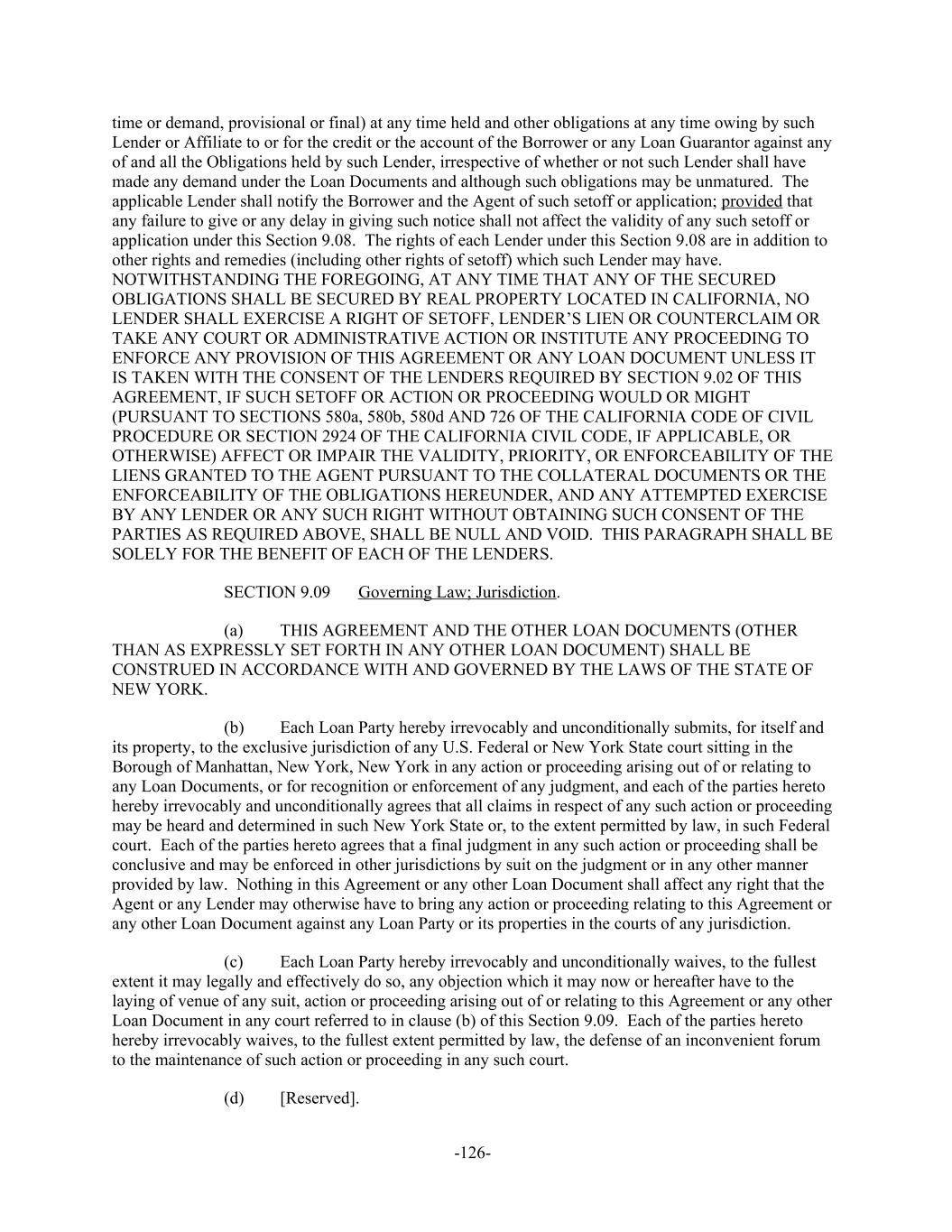 time or demand, provisional or final) at any time held and other obligations at any time owing by such Lender or Affiliate to or for the credit or the account of the Borrower or any Loan Guarantor against any of and all the Obligations held by such Lender, irrespective of whether or not such Lender shall have made any demand under the Loan Documents and although such obligations may be unmatured. The applicable Lender shall notify the Borrower and the Agent of such setoff or application; provided that any failure to give or any delay in giving such notice shall not affect the validity of any such setoff or application under this Section 9.08. The rights of each Lender under this Section 9.08 are in addition to other rights and remedies (including other rights of setoff) which such Lender may have. NOTWITHSTANDING THE FOREGOING, AT ANY TIME THAT ANY OF THE SECURED OBLIGATIONS SHALL BE SECURED BY REAL PROPERTY LOCATED IN CALIFORNIA, NO LENDER SHALL EXERCISE A RIGHT OF SETOFF, LENDER’S LIEN OR COUNTERCLAIM OR TAKE ANY COURT OR ADMINISTRATIVE ACTION OR INSTITUTE ANY PROCEEDING TO ENFORCE ANY PROVISION OF THIS AGREEMENT OR ANY LOAN DOCUMENT UNLESS IT IS TAKEN WITH THE CONSENT OF THE LENDERS REQUIRED BY SECTION 9.02 OF THIS AGREEMENT, IF SUCH SETOFF OR ACTION OR PROCEEDING WOULD OR MIGHT (PURSUANT TO SECTIONS 580a, 580b, 580d AND 726 OF THE CALIFORNIA CODE OF CIVIL PROCEDURE OR SECTION 2924 OF THE CALIFORNIA CIVIL CODE, IF APPLICABLE, OR OTHERWISE) AFFECT OR IMPAIR THE VALIDITY, PRIORITY, OR ENFORCEABILITY OF THE LIENS GRANTED TO THE AGENT PURSUANT TO THE COLLATERAL DOCUMENTS OR THE ENFORCEABILITY OF THE OBLIGATIONS HEREUNDER, AND ANY ATTEMPTED EXERCISE BY ANY LENDER OR ANY SUCH RIGHT WITHOUT OBTAINING SUCH CONSENT OF THE PARTIES AS REQUIRED ABOVE, SHALL BE NULL AND VOID. THIS PARAGRAPH SHALL BE SOLELY FOR THE BENEFIT OF EACH OF THE LENDERS. Governing Law; Jurisdiction.SECTION 9.09 THIS AGREEMENT AND THE OTHER LOAN DOCUMENTS (OTHER(a) THAN AS EXPRESSLY SET FORTH IN ANY OTHER LOAN DOCUMENT) SHALL BE CONSTRUED IN ACCORDANCE WITH AND GOVERNED BY THE LAWS OF THE STATE OF NEW YORK. Each Loan Party hereby irrevocably and unconditionally submits, for itself and(b) its property, to the exclusive jurisdiction of any U.S. Federal or New York State court sitting in the Borough of Manhattan, New York, New York in any action or proceeding arising out of or relating to any Loan Documents, or for recognition or enforcement of any judgment, and each of the parties hereto hereby irrevocably and unconditionally agrees that all claims in respect of any such action or proceeding may be heard and determined in such New York State or, to the extent permitted by law, in such Federal court. Each of the parties hereto agrees that a final judgment in any such action or proceeding shall be conclusive and may be enforced in other jurisdictions by suit on the judgment or in any other manner provided by law. Nothing in this Agreement or any other Loan Document shall affect any right that the Agent or any Lender may otherwise have to bring any action or proceeding relating to this Agreement or any other Loan Document against any Loan Party or its properties in the courts of any jurisdiction. Each Loan Party hereby irrevocably and unconditionally waives, to the fullest(c) extent it may legally and effectively do so, any objection which it may now or hereafter have to the laying of venue of any suit, action or proceeding arising out of or relating to this Agreement or any other Loan Document in any court referred to in clause (b) of this Section 9.09. Each of the parties hereto hereby irrevocably waives, to the fullest extent permitted by law, the defense of an inconvenient forum to the maintenance of such action or proceeding in any such court. [Reserved].(d) -126-