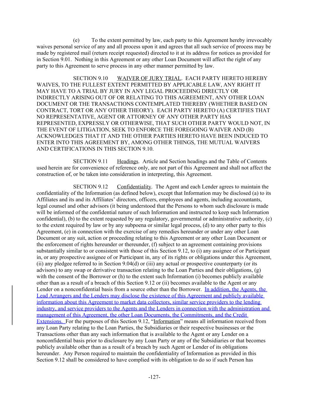 To the extent permitted by law, each party to this Agreement hereby irrevocably(e) waives personal service of any and all process upon it and agrees that all such service of process may be made by registered mail (return receipt requested) directed to it at its address for notices as provided for in Section 9.01. Nothing in this Agreement or any other Loan Document will affect the right of any party to this Agreement to serve process in any other manner permitted by law. WAIVER OF JURY TRIAL. EACH PARTY HERETO HEREBYSECTION 9.10 WAIVES, TO THE FULLEST EXTENT PERMITTED BY APPLICABLE LAW, ANY RIGHT IT MAY HAVE TO A TRIAL BY JURY IN ANY LEGAL PROCEEDING DIRECTLY OR INDIRECTLY ARISING OUT OF OR RELATING TO THIS AGREEMENT, ANY OTHER LOAN DOCUMENT OR THE TRANSACTIONS CONTEMPLATED THEREBY (WHETHER BASED ON CONTRACT, TORT OR ANY OTHER THEORY). EACH PARTY HERETO (A) CERTIFIES THAT NO REPRESENTATIVE, AGENT OR ATTORNEY OF ANY OTHER PARTY HAS REPRESENTED, EXPRESSLY OR OTHERWISE, THAT SUCH OTHER PARTY WOULD NOT, IN THE EVENT OF LITIGATION, SEEK TO ENFORCE THE FOREGOING WAIVER AND (B) ACKNOWLEDGES THAT IT AND THE OTHER PARTIES HERETO HAVE BEEN INDUCED TO ENTER INTO THIS AGREEMENT BY, AMONG OTHER THINGS, THE MUTUAL WAIVERS AND CERTIFICATIONS IN THIS SECTION 9.10. Headings. Article and Section headings and the Table of ContentsSECTION 9.11 used herein are for convenience of reference only, are not part of this Agreement and shall not affect the construction of, or be taken into consideration in interpreting, this Agreement. Confidentiality. The Agent and each Lender agrees to maintain theSECTION 9.12 confidentiality of the Information (as defined below), except that Information may be disclosed (a) to its Affiliates and its and its Affiliates’ directors, officers, employees and agents, including accountants, legal counsel and other advisors (it being understood that the Persons to whom such disclosure is made will be informed of the confidential nature of such Information and instructed to keep such Information confidential), (b) to the extent requested by any regulatory, governmental or administrative authority, (c) to the extent required by law or by any subpoena or similar legal process, (d) to any other party to this Agreement, (e) in connection with the exercise of any remedies hereunder or under any other Loan Document or any suit, action or proceeding relating to this Agreement or any other Loan Document or the enforcement of rights hereunder or thereunder, (f) subject to an agreement containing provisions substantially similar to or consistent with those of this Section 9.12, to (i) any assignee of or Participant in, or any prospective assignee of or Participant in, any of its rights or obligations under this Agreement, (ii) any pledgee referred to in Section 9.04(d) or (iii) any actual or prospective counterparty (or its advisors) to any swap or derivative transaction relating to the Loan Parties and their obligations, (g) with the consent of the Borrower or (h) to the extent such Information (i) becomes publicly available other than as a result of a breach of this Section 9.12 or (ii) becomes available to the Agent or any Lender on a nonconfidential basis from a source other than the Borrower. In addition, the Agents, the Lead Arrangers and the Lenders may disclose the existence of this Agreement and publicly available information about this Agreement to market data collectors, similar service providers to the lending industry, and service providers to the Agents and the Lenders in connection with the administration and management of this Agreement, the other Loan Documents, the Commitments, and the Credit Extensions. For the purposes of this Section 9.12, “Information” means all information received from any Loan Party relating to the Loan Parties, the Subsidiaries or their respective businesses or the Transactions other than any such information that is available to the Agent or any Lender on a nonconfidential basis prior to disclosure by any Loan Party or any of the Subsidiaries or that becomes publicly available other than as a result of a breach by such Agent or Lender of its obligations hereunder. Any Person required to maintain the confidentiality of Information as provided in this Section 9.12 shall be considered to have complied with its obligation to do so if such Person has -127-