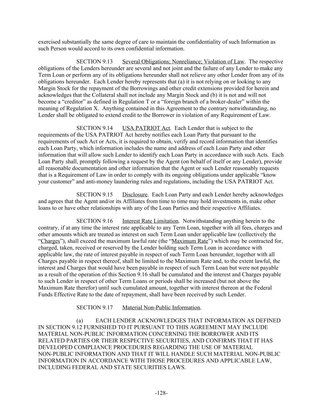 exercised substantially the same degree of care to maintain the confidentiality of such Information as such Person would accord to its own confidential information. Several Obligations; Nonreliance; Violation of Law. The respectiveSECTION 9.13 obligations of the Lenders hereunder are several and not joint and the failure of any Lender to make any Term Loan or perform any of its obligations hereunder shall not relieve any other Lender from any of its obligations hereunder. Each Lender hereby represents that (a) it is not relying on or looking to any Margin Stock for the repayment of the Borrowings and other credit extensions provided for herein and acknowledges that the Collateral shall not include any Margin Stock and (b) it is not and will not become a “creditor” as defined in Regulation T or a “foreign branch of a broker-dealer” within the meaning of Regulation X. Anything contained in this Agreement to the contrary notwithstanding, no Lender shall be obligated to extend credit to the Borrower in violation of any Requirement of Law. USA PATRIOT Act. Each Lender that is subject to theSECTION 9.14 requirements of the USA PATRIOT Act hereby notifies each Loan Party that pursuant to the requirements of such Act or Acts, it is required to obtain, verify and record information that identifies each Loan Party, which information includes the name and address of each Loan Party and other information that will allow such Lender to identify each Loan Party in accordance with such Acts. Each Loan Party shall, promptly following a request by the Agent (on behalf of itself or any Lender), provide all reasonable documentation and other information that the Agent or such Lender reasonably requests that is a Requirement of Law in order to comply with its ongoing obligations under applicable “know your customer” and anti-money laundering rules and regulations, including the USA PATRIOT Act. Disclosure. Each Loan Party and each Lender hereby acknowledgesSECTION 9.15 and agrees that the Agent and/or its Affiliates from time to time may hold investments in, make other loans to or have other relationships with any of the Loan Parties and their respective Affiliates. Interest Rate Limitation. Notwithstanding anything herein to theSECTION 9.16 contrary, if at any time the interest rate applicable to any Term Loan, together with all fees, charges and other amounts which are treated as interest on such Term Loan under applicable law (collectively the “Charges”), shall exceed the maximum lawful rate (the “Maximum Rate”) which may be contracted for, charged, taken, received or reserved by the Lender holding such Term Loan in accordance with applicable law, the rate of interest payable in respect of such Term Loan hereunder, together with all Charges payable in respect thereof, shall be limited to the Maximum Rate and, to the extent lawful, the interest and Charges that would have been payable in respect of such Term Loan but were not payable as a result of the operation of this Section 9.16 shall be cumulated and the interest and Charges payable to such Lender in respect of other Term Loans or periods shall be increased (but not above the Maximum Rate therefor) until such cumulated amount, together with interest thereon at the Federal Funds Effective Rate to the date of repayment, shall have been received by such Lender. Material Non-Public Information.SECTION 9.17 EACH LENDER ACKNOWLEDGES THAT INFORMATION AS DEFINED(a) IN SECTION 9.12 FURNISHED TO IT PURSUANT TO THIS AGREEMENT MAY INCLUDE MATERIAL NON-PUBLIC INFORMATION CONCERNING THE BORROWER AND ITS RELATED PARTIES OR THEIR RESPECTIVE SECURITIES, AND CONFIRMS THAT IT HAS DEVELOPED COMPLIANCE PROCEDURES REGARDING THE USE OF MATERIAL NON-PUBLIC INFORMATION AND THAT IT WILL HANDLE SUCH MATERIAL NON-PUBLIC INFORMATION IN ACCORDANCE WITH THOSE PROCEDURES AND APPLICABLE LAW, INCLUDING FEDERAL AND STATE SECURITIES LAWS. -128-