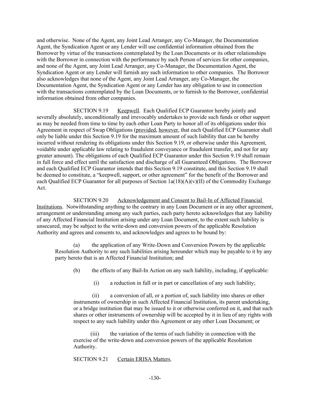 and otherwise. None of the Agent, any Joint Lead Arranger, any Co-Manager, the Documentation Agent, the Syndication Agent or any Lender will use confidential information obtained from the Borrower by virtue of the transactions contemplated by the Loan Documents or its other relationships with the Borrower in connection with the performance by such Person of services for other companies, and none of the Agent, any Joint Lead Arranger, any Co-Manager, the Documentation Agent, the Syndication Agent or any Lender will furnish any such information to other companies. The Borrower also acknowledges that none of the Agent, any Joint Lead Arranger, any Co-Manager, the Documentation Agent, the Syndication Agent or any Lender has any obligation to use in connection with the transactions contemplated by the Loan Documents, or to furnish to the Borrower, confidential information obtained from other companies. Keepwell. Each Qualified ECP Guarantor hereby jointly andSECTION 9.19 severally absolutely, unconditionally and irrevocably undertakes to provide such funds or other support as may be needed from time to time by each other Loan Party to honor all of its obligations under this Agreement in respect of Swap Obligations (provided, however, that each Qualified ECP Guarantor shall only be liable under this Section 9.19 for the maximum amount of such liability that can be hereby incurred without rendering its obligations under this Section 9.19, or otherwise under this Agreement, voidable under applicable law relating to fraudulent conveyance or fraudulent transfer, and not for any greater amount). The obligations of each Qualified ECP Guarantor under this Section 9.19 shall remain in full force and effect until the satisfaction and discharge of all Guaranteed Obligations. The Borrower and each Qualified ECP Guarantor intends that this Section 9.19 constitute, and this Section 9.19 shall be deemed to constitute, a “keepwell, support, or other agreement” for the benefit of the Borrower and each Qualified ECP Guarantor for all purposes of Section 1a(18)(A)(v)(II) of the Commodity Exchange Act. Acknowledgement and Consent to Bail-In of Affected Financial SECTION 9.20 Institutions. Notwithstanding anything to the contrary in any Loan Document or in any other agreement, arrangement or understanding among any such parties, each party hereto acknowledges that any liability of any Affected Financial Institution arising under any Loan Document, to the extent such liability is unsecured, may be subject to the write-down and conversion powers of the applicable Resolution Authority and agrees and consents to, and acknowledges and agrees to be bound by: (a) the application of any Write-Down and Conversion Powers by the applicable Resolution Authority to any such liabilities arising hereunder which may be payable to it by any party hereto that is an Affected Financial Institution; and (b) the effects of any Bail-In Action on any such liability, including, if applicable: (i) a reduction in full or in part or cancellation of any such liability; (ii) a conversion of all, or a portion of, such liability into shares or other instruments of ownership in such Affected Financial Institution, its parent undertaking, or a bridge institution that may be issued to it or otherwise conferred on it, and that such shares or other instruments of ownership will be accepted by it in lieu of any rights with respect to any such liability under this Agreement or any other Loan Document; or (iii) the variation of the terms of such liability in connection with the exercise of the write-down and conversion powers of the applicable Resolution Authority. Certain ERISA Matters.SECTION 9.21 -130-
