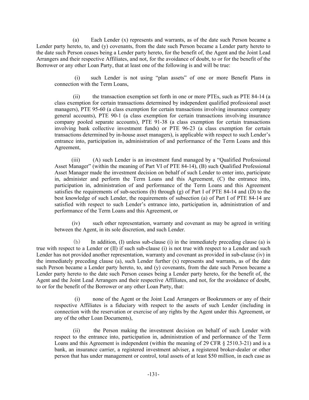 Each Lender (x) represents and warrants, as of the date such Person became a(a) Lender party hereto, to, and (y) covenants, from the date such Person became a Lender party hereto to the date such Person ceases being a Lender party hereto, for the benefit of, the Agent and the Joint Lead Arrangers and their respective Affiliates, and not, for the avoidance of doubt, to or for the benefit of the Borrower or any other Loan Party, that at least one of the following is and will be true: such Lender is not using “plan assets” of one or more Benefit Plans in(i) connection with the Term Loans, the transaction exemption set forth in one or more PTEs, such as PTE 84-14 (a(ii) class exemption for certain transactions determined by independent qualified professional asset managers), PTE 95-60 (a class exemption for certain transactions involving insurance company general accounts), PTE 90-1 (a class exemption for certain transactions involving insurance company pooled separate accounts), PTE 91-38 (a class exemption for certain transactions involving bank collective investment funds) or PTE 96-23 (a class exemption for certain transactions determined by in-house asset managers), is applicable with respect to such Lender’s entrance into, participation in, administration of and performance of the Term Loans and this Agreement, (A) such Lender is an investment fund managed by a “Qualified Professional(iii) Asset Manager” (within the meaning of Part VI of PTE 84-14), (B) such Qualified Professional Asset Manager made the investment decision on behalf of such Lender to enter into, participate in, administer and perform the Term Loans and this Agreement, (C) the entrance into, participation in, administration of and performance of the Term Loans and this Agreement satisfies the requirements of sub-sections (b) through (g) of Part I of PTE 84-14 and (D) to the best knowledge of such Lender, the requirements of subsection (a) of Part I of PTE 84-14 are satisfied with respect to such Lender’s entrance into, participation in, administration of and performance of the Term Loans and this Agreement, or such other representation, warranty and covenant as may be agreed in writing(iv) between the Agent, in its sole discretion, and such Lender. In addition, (I) unless sub-clause (i) in the immediately preceding clause (a) is(b) true with respect to a Lender or (II) if such sub-clause (i) is not true with respect to a Lender and such Lender has not provided another representation, warranty and covenant as provided in sub-clause (iv) in the immediately preceding clause (a), such Lender further (x) represents and warrants, as of the date such Person became a Lender party hereto, to, and (y) covenants, from the date such Person became a Lender party hereto to the date such Person ceases being a Lender party hereto, for the benefit of, the Agent and the Joint Lead Arrangers and their respective Affiliates, and not, for the avoidance of doubt, to or for the benefit of the Borrower or any other Loan Party, that: none of the Agent or the Joint Lead Arrangers or Bookrunners or any of their(i) respective Affiliates is a fiduciary with respect to the assets of such Lender (including in connection with the reservation or exercise of any rights by the Agent under this Agreement, or any of the other Loan Documents), the Person making the investment decision on behalf of such Lender with(ii) respect to the entrance into, participation in, administration of and performance of the Term Loans and this Agreement is independent (within the meaning of 29 CFR § 2510.3-21) and is a bank, an insurance carrier, a registered investment adviser, a registered broker-dealer or other person that has under management or control, total assets of at least $50 million, in each case as -131-