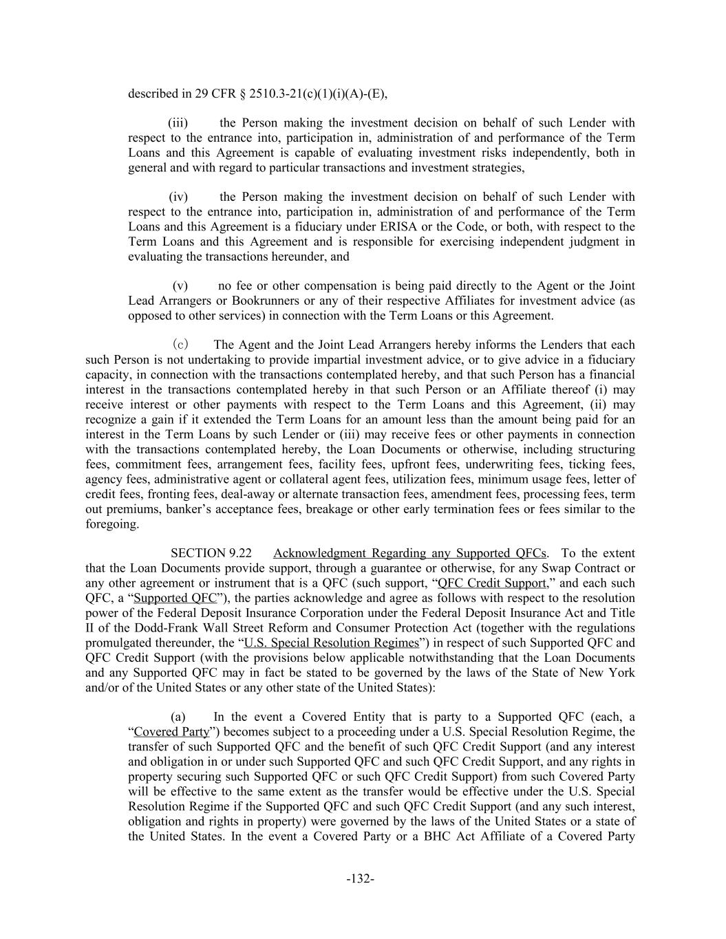 described in 29 CFR § 2510.3-21(c)(1)(i)(A)-(E), the Person making the investment decision on behalf of such Lender with(iii) respect to the entrance into, participation in, administration of and performance of the Term Loans and this Agreement is capable of evaluating investment risks independently, both in general and with regard to particular transactions and investment strategies, the Person making the investment decision on behalf of such Lender with(iv) respect to the entrance into, participation in, administration of and performance of the Term Loans and this Agreement is a fiduciary under ERISA or the Code, or both, with respect to the Term Loans and this Agreement and is responsible for exercising independent judgment in evaluating the transactions hereunder, and no fee or other compensation is being paid directly to the Agent or the Joint(v) Lead Arrangers or Bookrunners or any of their respective Affiliates for investment advice (as opposed to other services) in connection with the Term Loans or this Agreement. The Agent and the Joint Lead Arrangers hereby informs the Lenders that each(c) such Person is not undertaking to provide impartial investment advice, or to give advice in a fiduciary capacity, in connection with the transactions contemplated hereby, and that such Person has a financial interest in the transactions contemplated hereby in that such Person or an Affiliate thereof (i) may receive interest or other payments with respect to the Term Loans and this Agreement, (ii) may recognize a gain if it extended the Term Loans for an amount less than the amount being paid for an interest in the Term Loans by such Lender or (iii) may receive fees or other payments in connection with the transactions contemplated hereby, the Loan Documents or otherwise, including structuring fees, commitment fees, arrangement fees, facility fees, upfront fees, underwriting fees, ticking fees, agency fees, administrative agent or collateral agent fees, utilization fees, minimum usage fees, letter of credit fees, fronting fees, deal-away or alternate transaction fees, amendment fees, processing fees, term out premiums, banker’s acceptance fees, breakage or other early termination fees or fees similar to the foregoing. Acknowledgment Regarding any Supported QFCs. To the extentSECTION 9.22 that the Loan Documents provide support, through a guarantee or otherwise, for any Swap Contract or any other agreement or instrument that is a QFC (such support, “QFC Credit Support,” and each such QFC, a “Supported QFC”), the parties acknowledge and agree as follows with respect to the resolution power of the Federal Deposit Insurance Corporation under the Federal Deposit Insurance Act and Title II of the Dodd-Frank Wall Street Reform and Consumer Protection Act (together with the regulations promulgated thereunder, the “U.S. Special Resolution Regimes”) in respect of such Supported QFC and QFC Credit Support (with the provisions below applicable notwithstanding that the Loan Documents and any Supported QFC may in fact be stated to be governed by the laws of the State of New York and/or of the United States or any other state of the United States): In the event a Covered Entity that is party to a Supported QFC (each, a(a) “Covered Party”) becomes subject to a proceeding under a U.S. Special Resolution Regime, the transfer of such Supported QFC and the benefit of such QFC Credit Support (and any interest and obligation in or under such Supported QFC and such QFC Credit Support, and any rights in property securing such Supported QFC or such QFC Credit Support) from such Covered Party will be effective to the same extent as the transfer would be effective under the U.S. Special Resolution Regime if the Supported QFC and such QFC Credit Support (and any such interest, obligation and rights in property) were governed by the laws of the United States or a state of the United States. In the event a Covered Party or a BHC Act Affiliate of a Covered Party -132-