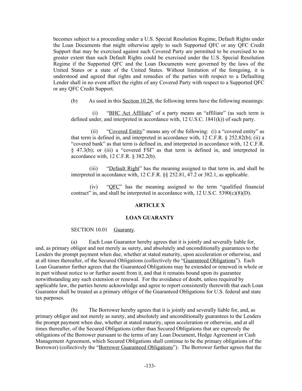 becomes subject to a proceeding under a U.S. Special Resolution Regime, Default Rights under the Loan Documents that might otherwise apply to such Supported QFC or any QFC Credit Support that may be exercised against such Covered Party are permitted to be exercised to no greater extent than such Default Rights could be exercised under the U.S. Special Resolution Regime if the Supported QFC and the Loan Documents were governed by the laws of the United States or a state of the United States. Without limitation of the foregoing, it is understood and agreed that rights and remedies of the parties with respect to a Defaulting Lender shall in no event affect the rights of any Covered Party with respect to a Supported QFC or any QFC Credit Support. As used in this Section 10.28, the following terms have the following meanings:(b) “BHC Act Affiliate” of a party means an “affiliate” (as such term is(i) defined under, and interpreted in accordance with, 12 U.S.C. 1841(k)) of such party. “Covered Entity” means any of the following: (i) a “covered entity” as(ii) that term is defined in, and interpreted in accordance with, 12 C.F.R. § 252.82(b); (ii) a “covered bank” as that term is defined in, and interpreted in accordance with, 12 C.F.R. § 47.3(b); or (iii) a “covered FSI” as that term is defined in, and interpreted in accordance with, 12 C.F.R. § 382.2(b). “Default Right” has the meaning assigned to that term in, and shall be(iii) interpreted in accordance with, 12 C.F.R. §§ 252.81, 47.2 or 382.1, as applicable. “QFC” has the meaning assigned to the term “qualified financial(iv) contract” in, and shall be interpreted in accordance with, 12 U.S.C. 5390(c)(8)(D). ARTICLE X LOAN GUARANTY Guaranty.SECTION 10.01 Each Loan Guarantor hereby agrees that it is jointly and severally liable for,(a) and, as primary obligor and not merely as surety, and absolutely and unconditionally guarantees to the Lenders the prompt payment when due, whether at stated maturity, upon acceleration or otherwise, and at all times thereafter, of the Secured Obligations (collectively the “Guaranteed Obligations”). Each Loan Guarantor further agrees that the Guaranteed Obligations may be extended or renewed in whole or in part without notice to or further assent from it, and that it remains bound upon its guarantee notwithstanding any such extension or renewal. For the avoidance of doubt, unless required by applicable law, the parties hereto acknowledge and agree to report consistently therewith that each Loan Guarantor shall be treated as a primary obligor of the Guaranteed Obligations for U.S. federal and state tax purposes. The Borrower hereby agrees that it is jointly and severally liable for, and, as(b) primary obligor and not merely as surety, and absolutely and unconditionally guarantees to the Lenders the prompt payment when due, whether at stated maturity, upon acceleration or otherwise, and at all times thereafter, of the Secured Obligations (other than Secured Obligations that are expressly the obligations of the Borrower pursuant to the terms of any Loan Document, Hedge Agreement or Cash Management Agreement, which Secured Obligations shall continue to be the primary obligations of the Borrower) (collectively the “Borrower Guaranteed Obligations”). The Borrower further agrees that the -133-