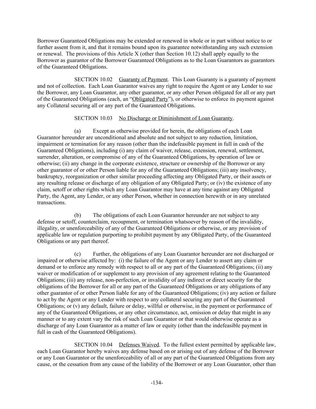 Borrower Guaranteed Obligations may be extended or renewed in whole or in part without notice to or further assent from it, and that it remains bound upon its guarantee notwithstanding any such extension or renewal. The provisions of this Article X (other than Section 10.12) shall apply equally to the Borrower as guarantor of the Borrower Guaranteed Obligations as to the Loan Guarantors as guarantors of the Guaranteed Obligations. Guaranty of Payment. This Loan Guaranty is a guaranty of paymentSECTION 10.02 and not of collection. Each Loan Guarantor waives any right to require the Agent or any Lender to sue the Borrower, any Loan Guarantor, any other guarantor, or any other Person obligated for all or any part of the Guaranteed Obligations (each, an “Obligated Party”), or otherwise to enforce its payment against any Collateral securing all or any part of the Guaranteed Obligations. No Discharge or Diminishment of Loan Guaranty.SECTION 10.03 Except as otherwise provided for herein, the obligations of each Loan(a) Guarantor hereunder are unconditional and absolute and not subject to any reduction, limitation, impairment or termination for any reason (other than the indefeasible payment in full in cash of the Guaranteed Obligations), including (i) any claim of waiver, release, extension, renewal, settlement, surrender, alteration, or compromise of any of the Guaranteed Obligations, by operation of law or otherwise; (ii) any change in the corporate existence, structure or ownership of the Borrower or any other guarantor of or other Person liable for any of the Guaranteed Obligations; (iii) any insolvency, bankruptcy, reorganization or other similar proceeding affecting any Obligated Party, or their assets or any resulting release or discharge of any obligation of any Obligated Party; or (iv) the existence of any claim, setoff or other rights which any Loan Guarantor may have at any time against any Obligated Party, the Agent, any Lender, or any other Person, whether in connection herewith or in any unrelated transactions. The obligations of each Loan Guarantor hereunder are not subject to any(b) defense or setoff, counterclaim, recoupment, or termination whatsoever by reason of the invalidity, illegality, or unenforceability of any of the Guaranteed Obligations or otherwise, or any provision of applicable law or regulation purporting to prohibit payment by any Obligated Party, of the Guaranteed Obligations or any part thereof. Further, the obligations of any Loan Guarantor hereunder are not discharged or(c) impaired or otherwise affected by: (i) the failure of the Agent or any Lender to assert any claim or demand or to enforce any remedy with respect to all or any part of the Guaranteed Obligations; (ii) any waiver or modification of or supplement to any provision of any agreement relating to the Guaranteed Obligations; (iii) any release, non-perfection, or invalidity of any indirect or direct security for the obligations of the Borrower for all or any part of the Guaranteed Obligations or any obligations of any other guarantor of or other Person liable for any of the Guaranteed Obligations; (iv) any action or failure to act by the Agent or any Lender with respect to any collateral securing any part of the Guaranteed Obligations; or (v) any default, failure or delay, willful or otherwise, in the payment or performance of any of the Guaranteed Obligations, or any other circumstance, act, omission or delay that might in any manner or to any extent vary the risk of such Loan Guarantor or that would otherwise operate as a discharge of any Loan Guarantor as a matter of law or equity (other than the indefeasible payment in full in cash of the Guaranteed Obligations). Defenses Waived. To the fullest extent permitted by applicable law,SECTION 10.04 each Loan Guarantor hereby waives any defense based on or arising out of any defense of the Borrower or any Loan Guarantor or the unenforceability of all or any part of the Guaranteed Obligations from any cause, or the cessation from any cause of the liability of the Borrower or any Loan Guarantor, other than -134-