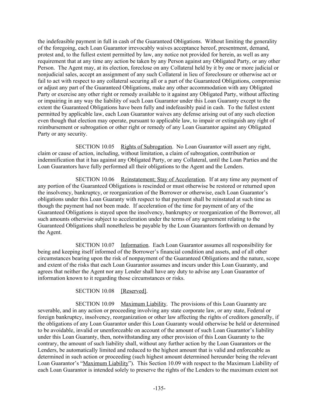 the indefeasible payment in full in cash of the Guaranteed Obligations. Without limiting the generality of the foregoing, each Loan Guarantor irrevocably waives acceptance hereof, presentment, demand, protest and, to the fullest extent permitted by law, any notice not provided for herein, as well as any requirement that at any time any action be taken by any Person against any Obligated Party, or any other Person. The Agent may, at its election, foreclose on any Collateral held by it by one or more judicial or nonjudicial sales, accept an assignment of any such Collateral in lieu of foreclosure or otherwise act or fail to act with respect to any collateral securing all or a part of the Guaranteed Obligations, compromise or adjust any part of the Guaranteed Obligations, make any other accommodation with any Obligated Party or exercise any other right or remedy available to it against any Obligated Party, without affecting or impairing in any way the liability of such Loan Guarantor under this Loan Guaranty except to the extent the Guaranteed Obligations have been fully and indefeasibly paid in cash. To the fullest extent permitted by applicable law, each Loan Guarantor waives any defense arising out of any such election even though that election may operate, pursuant to applicable law, to impair or extinguish any right of reimbursement or subrogation or other right or remedy of any Loan Guarantor against any Obligated Party or any security. Rights of Subrogation. No Loan Guarantor will assert any right,SECTION 10.05 claim or cause of action, including, without limitation, a claim of subrogation, contribution or indemnification that it has against any Obligated Party, or any Collateral, until the Loan Parties and the Loan Guarantors have fully performed all their obligations to the Agent and the Lenders. Reinstatement; Stay of Acceleration. If at any time any payment ofSECTION 10.06 any portion of the Guaranteed Obligations is rescinded or must otherwise be restored or returned upon the insolvency, bankruptcy, or reorganization of the Borrower or otherwise, each Loan Guarantor’s obligations under this Loan Guaranty with respect to that payment shall be reinstated at such time as though the payment had not been made. If acceleration of the time for payment of any of the Guaranteed Obligations is stayed upon the insolvency, bankruptcy or reorganization of the Borrower, all such amounts otherwise subject to acceleration under the terms of any agreement relating to the Guaranteed Obligations shall nonetheless be payable by the Loan Guarantors forthwith on demand by the Agent. Information. Each Loan Guarantor assumes all responsibility forSECTION 10.07 being and keeping itself informed of the Borrower’s financial condition and assets, and of all other circumstances bearing upon the risk of nonpayment of the Guaranteed Obligations and the nature, scope and extent of the risks that each Loan Guarantor assumes and incurs under this Loan Guaranty, and agrees that neither the Agent nor any Lender shall have any duty to advise any Loan Guarantor of information known to it regarding those circumstances or risks. [Reserved].SECTION 10.08 Maximum Liability. The provisions of this Loan Guaranty areSECTION 10.09 severable, and in any action or proceeding involving any state corporate law, or any state, Federal or foreign bankruptcy, insolvency, reorganization or other law affecting the rights of creditors generally, if the obligations of any Loan Guarantor under this Loan Guaranty would otherwise be held or determined to be avoidable, invalid or unenforceable on account of the amount of such Loan Guarantor’s liability under this Loan Guaranty, then, notwithstanding any other provision of this Loan Guaranty to the contrary, the amount of such liability shall, without any further action by the Loan Guarantors or the Lenders, be automatically limited and reduced to the highest amount that is valid and enforceable as determined in such action or proceeding (such highest amount determined hereunder being the relevant Loan Guarantor’s “Maximum Liability”). This Section 10.09 with respect to the Maximum Liability of each Loan Guarantor is intended solely to preserve the rights of the Lenders to the maximum extent not -135-