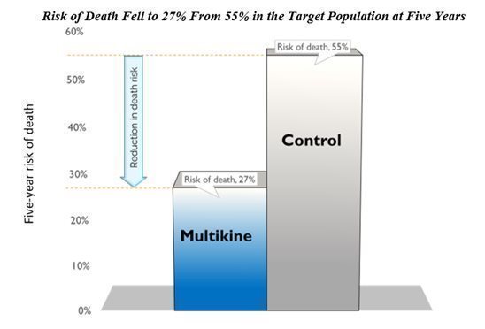 In the target patient population CEL-SCI believes Multikine significantly extended life. In the Phase III study, CEL-SCI observed a 73% survival rate with Multikine vs. only 45% without Multikine at 5 years after treatment, and a Hazard ratio of 0.35 (95% CIs [0.19, 0.66]).
