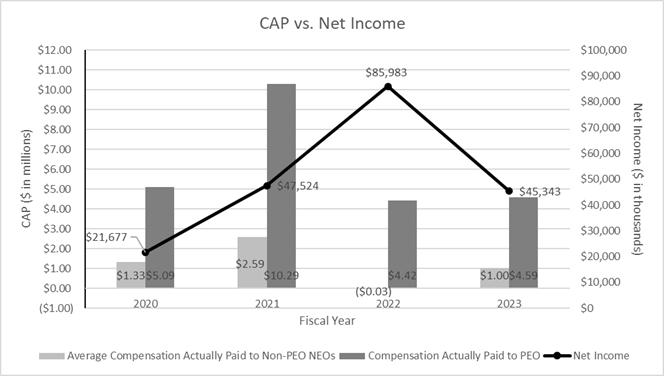 The graph below shows the relationship between (i) the CAP to our PEO and the average CAP to the non-PEO NEOs, and (ii) the Company’s net income during the last four completed fiscal years.