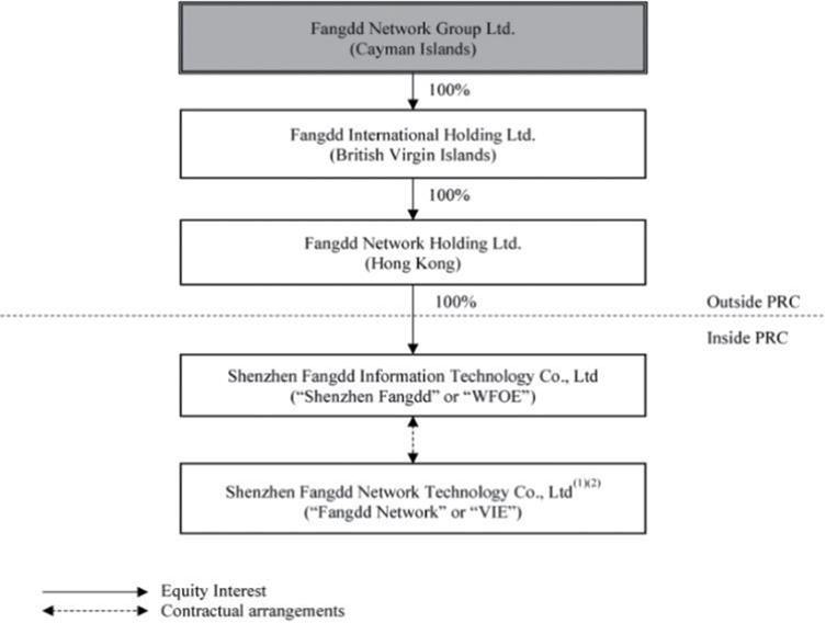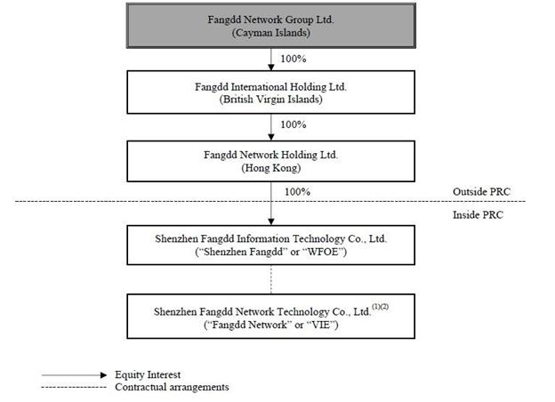Fangdd Network Group Ltd., or Fangdd Cayman, is a Cayman Islands holding company with no material operations of its own. We conduct our operations in China primarily through our PRC subsidiary Shenzhen Fangdd Information Technology Co., Ltd., or Shenzhen Fangdd or the WFOE, the VIE Shenzhen Fangdd Network Technology Co., Ltd., or Fangdd Network or the VIE, and the VIE’s subsidiaries. Foreign investment in the business involving value-added telecommunications service (except for e-commerce, domestic conferencing, store-and-forward, and call center services), including internet real estate services, is subject to significant restrictions under current PRC laws, rules and regulations. Accordingly, these businesses are operated by the VIE and the VIE’s subsidiaries. Investors in our Class A ordinary shares thus are not purchasing equity interests in our operating entities in China but instead are purchasing equity interests in Fangdd Cayman, a Cayman Islands holding company.