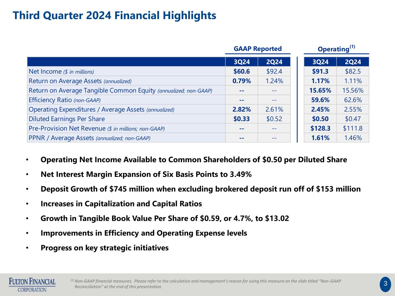 This presentation may contain forward-looking statements with respect to Fulton Financial Corporation's (the "Corporation“ or “Fulton”) financial condition, results of operations and business. Do not unduly rely on forward-looking statements. Forward-looking statements can be identified by the use of words such as "may," "should," "will," "could," "estimates," "predicts," "potential," "continue," "anticipates," "believes," "plans," "expects," "future," "intends," “projects,” the negative of these terms and other comparable terminology. These forward-looking statements may include projections of, or guidance on, the Corporation’s future financial performance, expected levels of future expenses, including future credit losses, anticipated growth strategies, descriptions of new business initiatives and anticipated trends in the Corporation’s business or financial results. Management’s "2024 Outlook" contained herein is comprised of forward-looking statements. Forward-looking statements are neither historical facts, nor assurance of future performance. Instead, the statements are based on current beliefs, expectations and assumptions regarding the future of the Corporation’s business, future plans and strategies, projections, anticipated events and trends, the economy and other future conditions. Because forward-looking statements relate to the future, they are subject to inherent uncertainties, risks and changes in circumstances that are difficult to predict and many of which are outside of the Corporation’s control, and actual results and financial condition may differ materially from those indicated in the forward-looking statements. Therefore, you should not unduly rely on any of these forward-looking statements. Any forward-looking statement is based only on information currently available and speaks only as of the date when made. The Corporation undertakes no obligation, other than as required by law, to update or revise any forward-looking statements, whether as a result of new information, future events or otherwise. A discussion of certain risks and uncertainties affecting the Corporation, and some of the factors that could cause the Corporation’s actual results to differ materially from those described in the forward-looking statements, can be found in the sections entitled “Risk Factors” and “Management’s Discussion and Analysis of Financial Condition and Results of Operations” in the Corporation’s Annual Report on Form 10-K for the year ended December 31, 2023, Quarterly Reports on Form 10-Q for the quarters ended March 31, 2024 and June 30, 2024 and other current and periodic reports, which have been, or will be, filed with the Securities and Exchange Commission(the "SEC") and are, or will be, available in the Investor Relations section of the Corporation’s website (www.fultonbank.com) and on the SEC’s website (www.sec.gov). The Corporation uses certain financial measures in this presentation that have been derived by methods other than generally accepted accounting principles ("GAAP"). These non-GAAP financial measures are reconciled to the most comparable GAAP measures at the end of this presentation. 2