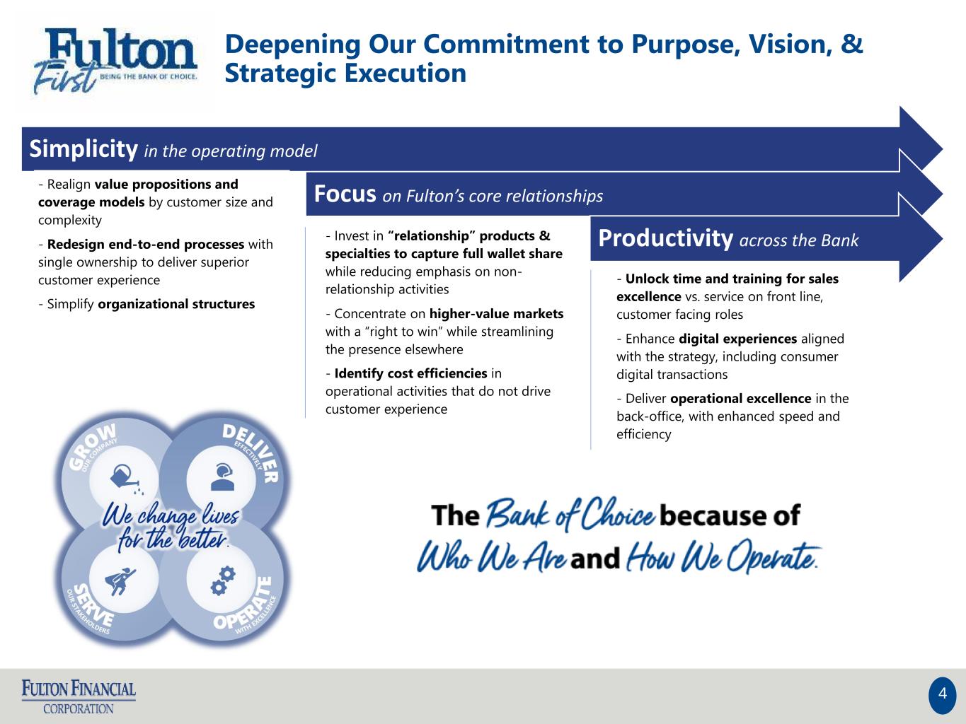 4 Deepening Our Commitment to Purpose, Vision, & Strategic Execution Simplicity in the operating model - Realign value propositions and coverage models by customer size and complexity - Redesign end-to-end processes with single ownership to deliver superior customer experience - Simplify organizational structures Focus on Fulton’s core relationships - Invest in “relationship” products & specialties to capture full wallet share while reducing emphasis on non- relationship activities - Concentrate on higher-value markets with a “right to win” while streamlining the presence elsewhere - Identify cost efficiencies in operational activities that do not drive customer experience Productivity across the Bank - Unlock time and training for sales excellence vs. service on front line, customer facing roles - Enhance digital experiences aligned with the strategy, including consumer digital transactions - Deliver operational excellence in the back-office, with enhanced speed and efficiency