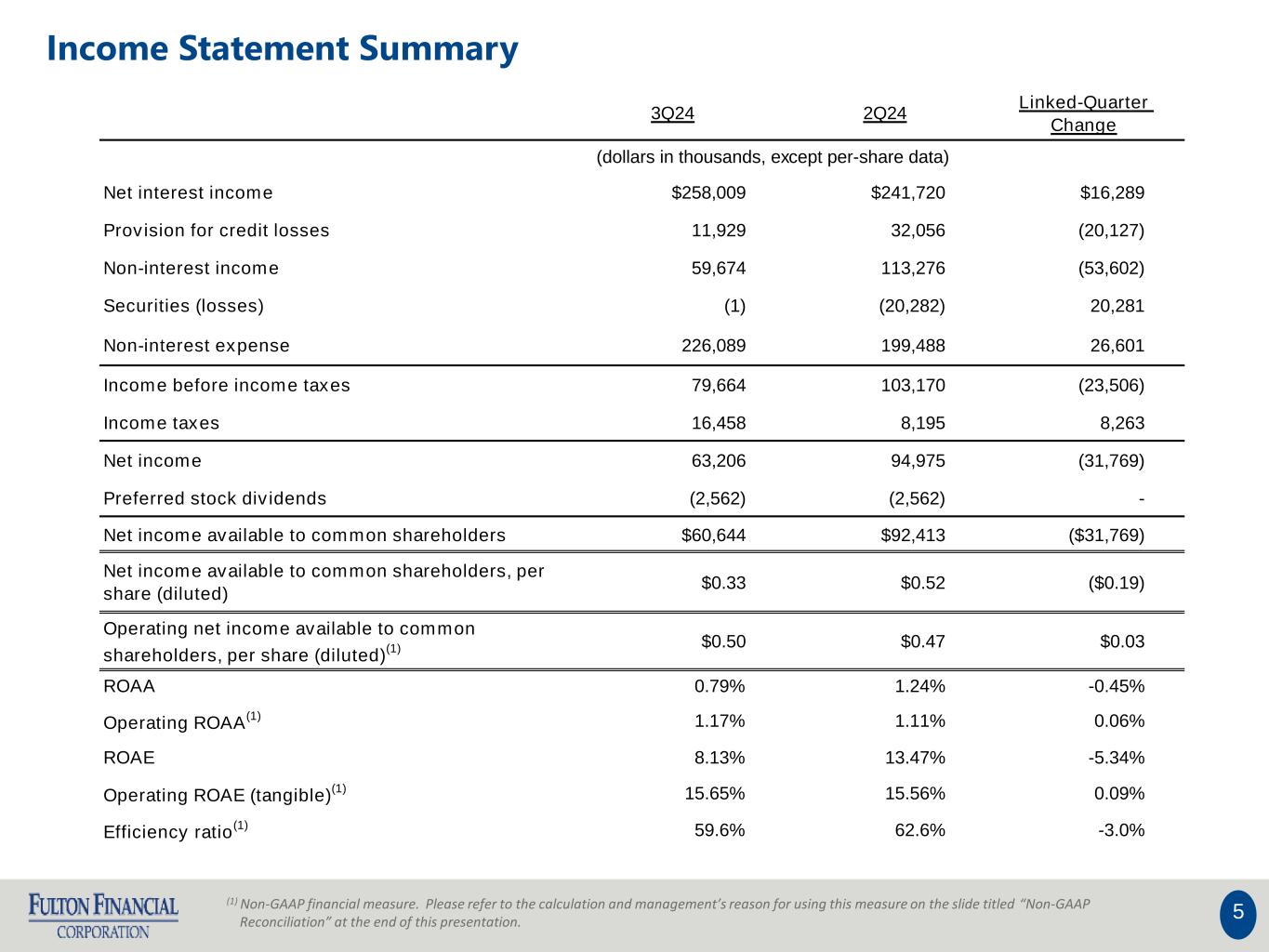 (October 15, 2024) – Lancaster, PA – Fulton Financial Corporation (NASDAQ: FULT) (“Fulton” or the “Corporation”) reported net income available to common shareholders of $60.6 million, or $0.33 per diluted share, for the third quarter of 2024, a decrease of $31.8 million, or $0.19 per share, in comparison to the second quarter of 2024. Operating net income available to common shareholders for the three months ended September 30, 2024 was $91.3 million, or $0.50 per diluted share(1), an increase of $8.8 million, or $0.03 per share, in comparison to the second quarter of 2024.