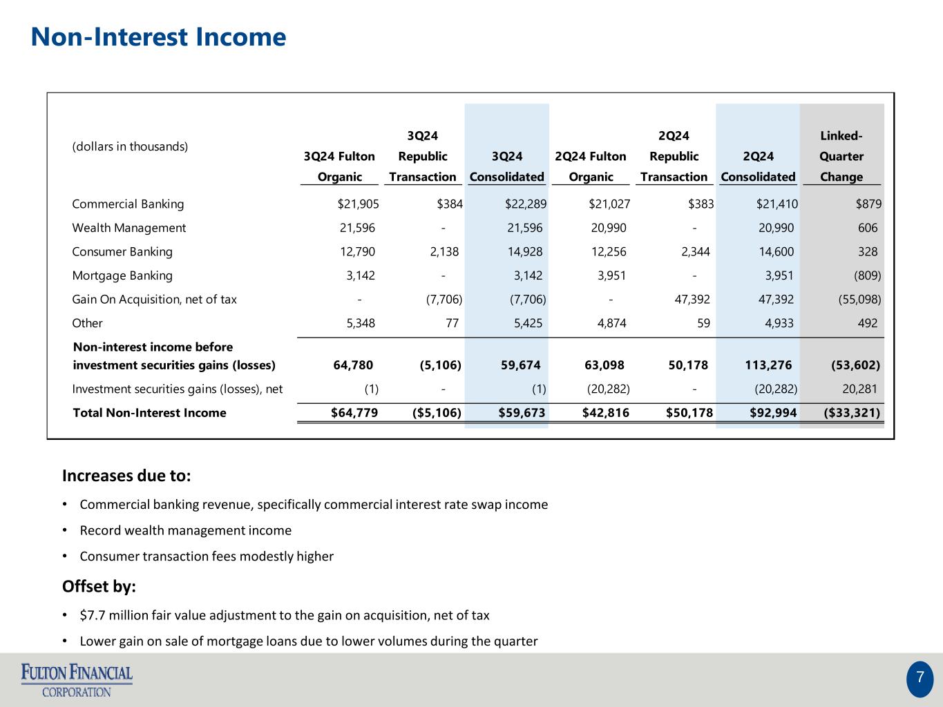 •Non-interest income before investment securities gains (losses) was $59.7 million compared to $113.3 million in the second quarter of 2024. The decrease was primarily due to a $55.1 million change in the gain on acquisition (net of tax) with a $7.7 million reduction recorded in the third quarter of 2024.