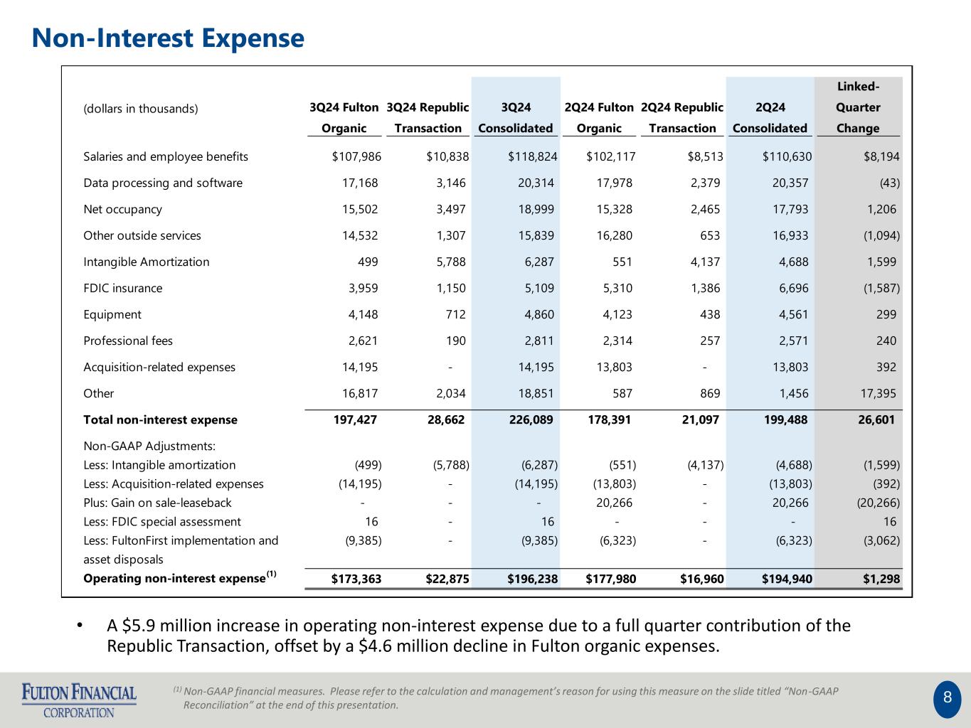 7 Non-Interest Income Increases due to: • Commercial banking revenue, specifically commercial interest rate swap income • Record wealth management income • Consumer transaction fees modestly higher Offset by: • $7.7 million fair value adjustment to the gain on acquisition, net of tax • Lower gain on sale of mortgage loans due to lower volumes during the quarter (dollars in thousands) 3Q24 Fulton Organic 3Q24 Republic Transaction 3Q24 Consolidated 2Q24 Fulton Organic 2Q24 Republic Transaction 2Q24 Consolidated Linked- Quarter Change Commercial Banking $21,905 $384 $22,289 $21,027 $383 $21,410 $879 Wealth Management 21,596 - 21,596 20,990 - 20,990 606 Consumer Banking 12,790 2,138 14,928 12,256 2,344 14,600 328 Mortgage Banking 3,142 - 3,142 3,951 - 3,951 (809) Gain On Acquisition, net of tax - (7,706) (7,706) - 47,392 47,392 (55,098) Other 5,348 77 5,425 4,874 59 4,933 492 Non-interest income before investment securities gains (losses) 64,780 (5,106) 59,674 63,098 50,178 113,276 (53,602) Investment securities gains (losses), net (1) - (1) (20,282) - (20,282) 20,281 Total Non-Interest Income $64,779 ($5,106) $59,673 $42,816 $50,178 $92,994 ($33,321)