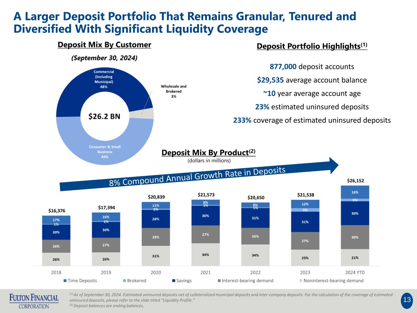 •Deposits totaled $26.2 billion, an increase of $592.5 million compared to $25.6 billion as of June 30, 2024. The increase was primarily due to increases of $374.2 million, $301.4 million and $177.1 million in time deposits, interest-bearing demand deposits and savings deposits, respectively, partially offset by decreases of $152.5 million in brokered deposits and $107.7 million in noninterest-bearing demand deposits. Deposits assumed in the Acquisition declined approximately $248.6 million since the Acquisition Date and increased approximately $108.7 million to $3.9 billion compared to the second quarter of 2024.