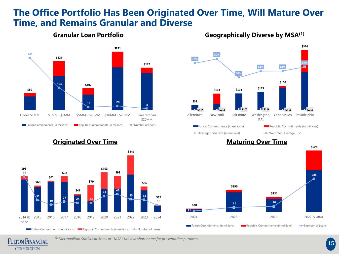 The Loan Portfolio Remains Diversified and Granular With Low Office Concentration at 3% of Total Loans 14 Office Only Profile • $876 million in office loan commitments • $812 million in office loans outstanding • representing 3% of total loans • Average loan size is $2.3 million • Weighted average loan-to-value(1) (“LTV”) ratio of 65% • Weighted average debt service coverage ratio (“DSCR”) of 1.33x • 84% of loans with full recourse; 68% LTV; 1.29x DSCR • 16% of loans non-recourse; 52% LTV; 1.57x DSCR • Nine relationships over $20 million, totaling $226 million in commitments, including: • Six relationships in central business districts • $216 million in commitments located in central business districts • Classification • 28% Class A • 20% Class B • 5% Class C • 47% Not Classified Total Loan Portfolio (September 30, 2024) (1) LTV as of most recent appraisal.