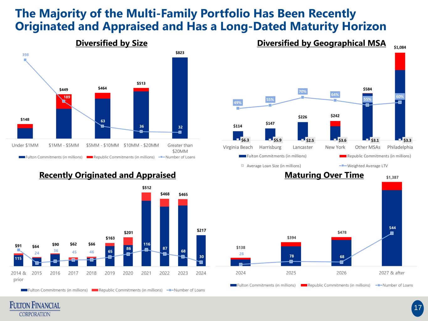 Multi-Family Loans Represent 8% of the Total Loan Portfolio With a Small Average Loan Size, Low LTV’S and Solid DSCR 16 (1) LTV as of most recent appraisal. Multi-Family Profile • $2.4 billion in multi-family loan commitments • $1.9 billion in multi-family loans outstanding • representing 8% of total loans • Average loan size is $3.3 million • Weighted average LTV(1) ratio of 59% • Weighted Average DSCR of 1.27x • 90% of loans with recourse • 31% construction; 69% stabilized • Classification o 42% Class A o 13% Class B o 4% Class C o 41% Not Classified Total Loan Portfolio (September 30, 2024)