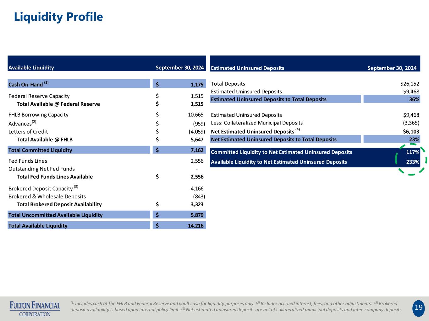 13 A Larger Deposit Portfolio That Remains Granular, Tenured and Diversified With Significant Liquidity Coverage Deposit Mix By Customer (September 30, 2024) Deposit Portfolio Highlights(1) 877,000 deposit accounts $29,535 average account balance ~10 year average account age 23% estimated uninsured deposits 233% coverage of estimated uninsured deposits Deposit Mix By Product(2) (1) As of September 30, 2024. Estimated uninsured deposits net of collateralized municipal deposits and inter-company deposits. For the calculation of the coverage of estimated uninsured deposits, please refer to the slide titled “Liquidity Profile.” (2) Deposit balances are ending balances. (dollars in millions)