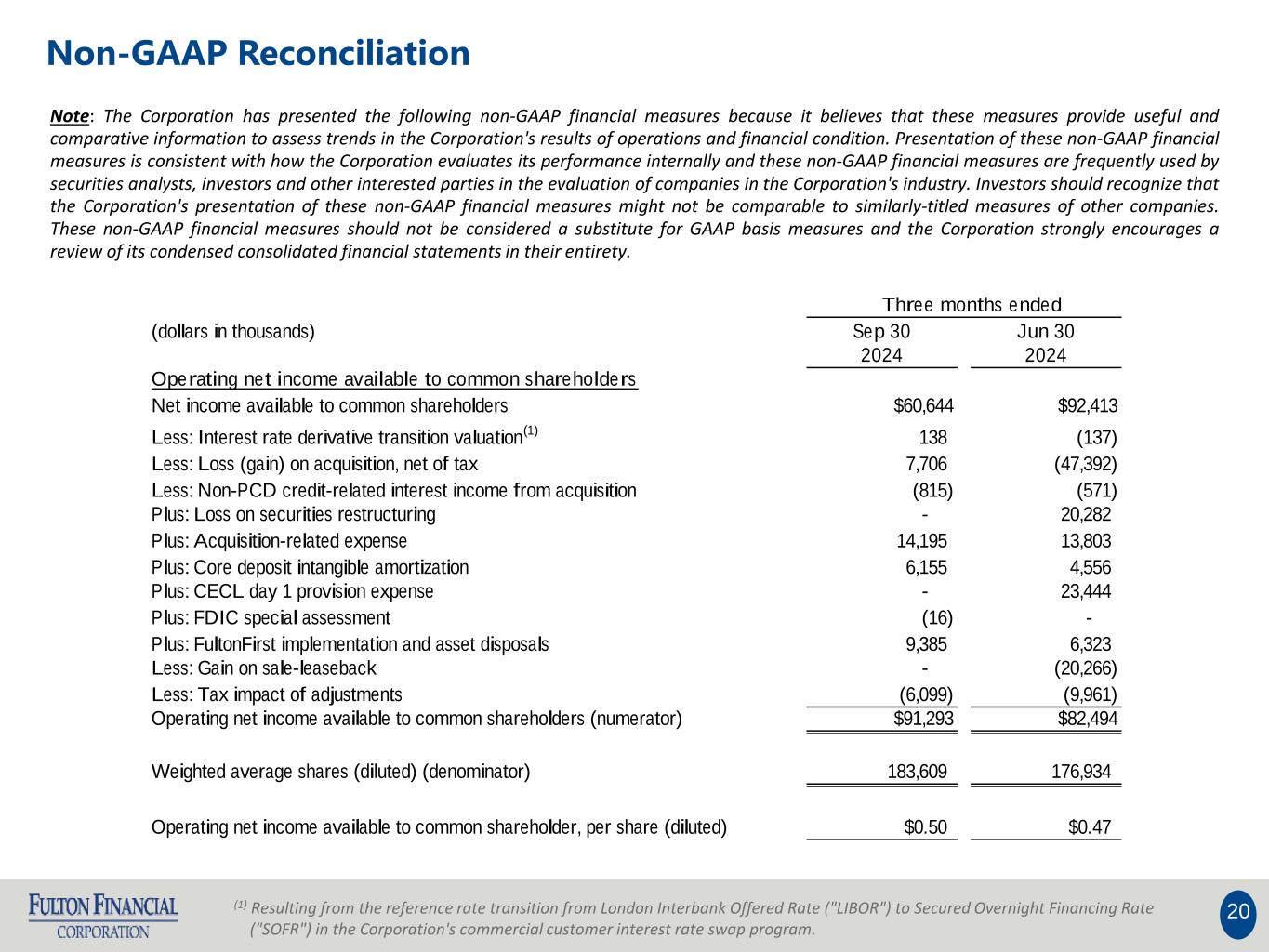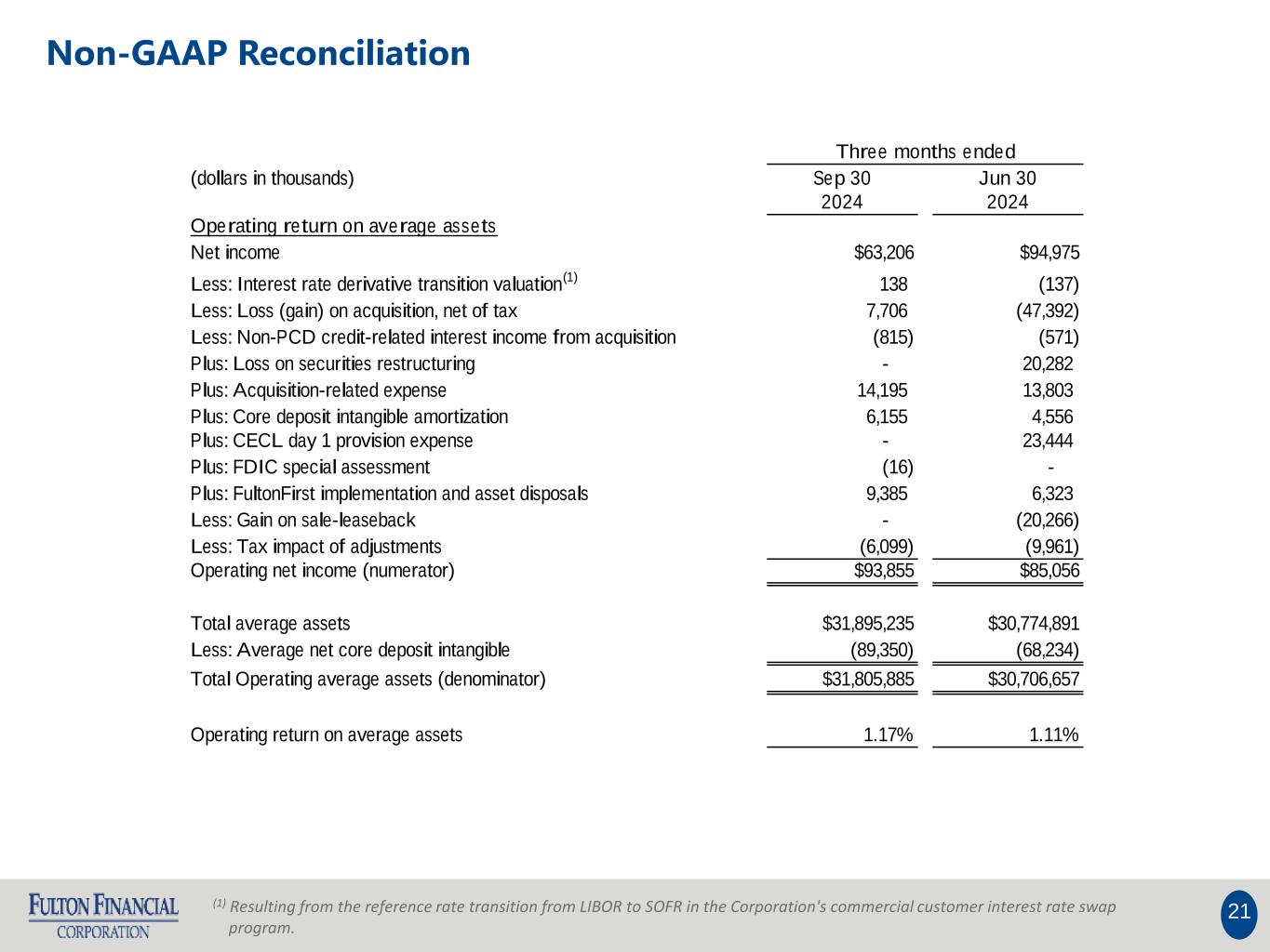 20 Note: The Corporation has presented the following non-GAAP financial measures because it believes that these measures provide useful and comparative information to assess trends in the Corporation's results of operations and financial condition. Presentation of these non-GAAP financial measures is consistent with how the Corporation evaluates its performance internally and these non-GAAP financial measures are frequently used by securities analysts, investors and other interested parties in the evaluation of companies in the Corporation's industry. Investors should recognize that the Corporation's presentation of these non-GAAP financial measures might not be comparable to similarly-titled measures of other companies. These non-GAAP financial measures should not be considered a substitute for GAAP basis measures and the Corporation strongly encourages a review of its condensed consolidated financial statements in their entirety. (1) Resulting from the reference rate transition from London Interbank Offered Rate ("LIBOR") to Secured Overnight Financing Rate ("SOFR") in the Corporation's commercial customer interest rate swap program. Non-GAAP Reconciliation Three months ended (dollars in thousands) Sep 30 Jun 30 2024 2024 Operating net income available to common shareholders Net income available to common shareholders $60,644 $92,413 Less: Interest rate derivative transition valuation (1) 138 (137) Less: Loss (gain) on acquisition, net of tax 7,706 (47,392) Less: Non-PCD credit-related interest income from acquisition (815) (571) Plus: Loss on securities restructuring - 20,282 Plus: Acquisition-related expense 14,195 13,803 Plus: Core deposit intangible amortization 6,155 4,556 Plus: CECL day 1 provision expense - 23,444 Plus: FDIC special assessment (16) - Plus: FultonFirst implementation and asset disposals 9,385 6,323 Less: Gain on sale-leaseback - (20,266) Less: Tax impact of adjustments (6,099) (9,961) Operating net income available to common shareholders (numerator) $91,293 $82,494 Weighted average shares (diluted) (denominator) 183,609 176,934 Operating net income available to common shareholder, per share (diluted) $0.50 $0.47