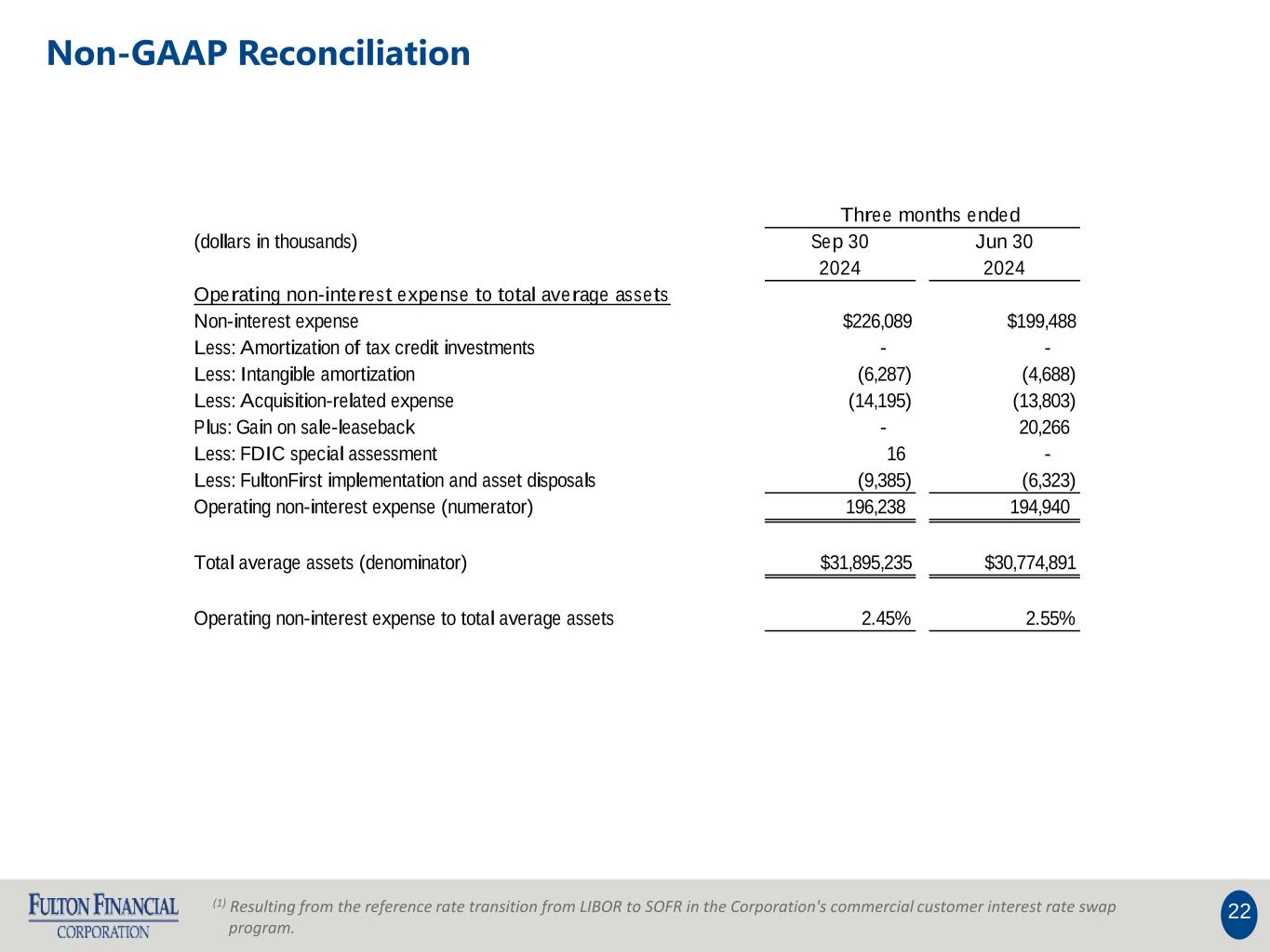 21 (1) Resulting from the reference rate transition from LIBOR to SOFR in the Corporation's commercial customer interest rate swap program. Non-GAAP Reconciliation (dollars in thousands) Sep 30 Jun 30 2024 2024 Operating return on average assets Net income $63,206 $94,975 Less: Interest rate derivative transition valuation (1) 138 (137) Less: Loss (gain) on acquisition, net of tax 7,706 (47,392) Less: Non-PCD credit-related interest income from acquisition (815) (571) Plus: Loss on securities restructuring - 20,282 Plus: Acquisition-related expense 14,195 13,803 Plus: Core deposit intangible amortization 6,155 4,556 Plus: CECL day 1 provision expense - 23,444 Plus: FDIC special assessment (16) - Plus: FultonFirst implementation and asset disposals 9,385 6,323 Less: Gain on sale-leaseback - (20,266) Less: Tax impact of adjustments (6,099) (9,961) Operating net income (numerator) $93,855 $85,056 Total average assets $31,895,235 $30,774,891 Less: Average net core deposit intangible (89,350) (68,234) Total Operating average assets (denominator) $31,805,885 $30,706,657 Operating return on average assets 1.17% 1.11% Three months ended