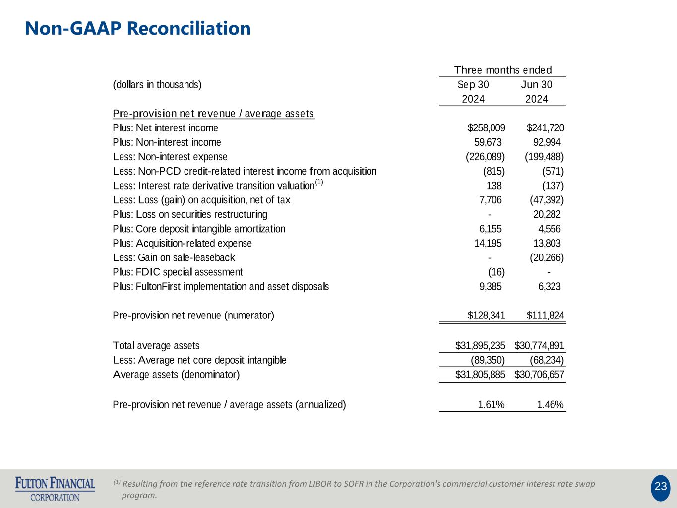 22 (1) Resulting from the reference rate transition from LIBOR to SOFR in the Corporation's commercial customer interest rate swap program. Non-GAAP Reconciliation Three months ended (dollars in thousands) Sep 30 Jun 30 2024 2024 Operating non-interest expense to total average assets Non-interest expense $226,089 $199,488 Less: Amortization of tax credit investments - - Less: Intangible amortization (6,287) (4,688) Less: Acquisition-related expense (14,195) (13,803) Plus: Gain on sale-leaseback - 20,266 Less: FDIC special assessment 16 - Less: FultonFirst implementation and asset disposals (9,385) (6,323) Operating non-interest expense (numerator) 196,238 194,940 Total average assets (denominator) $31,895,235 $30,774,891 Operating non-interest expense to total average assets 2.45% 2.55%