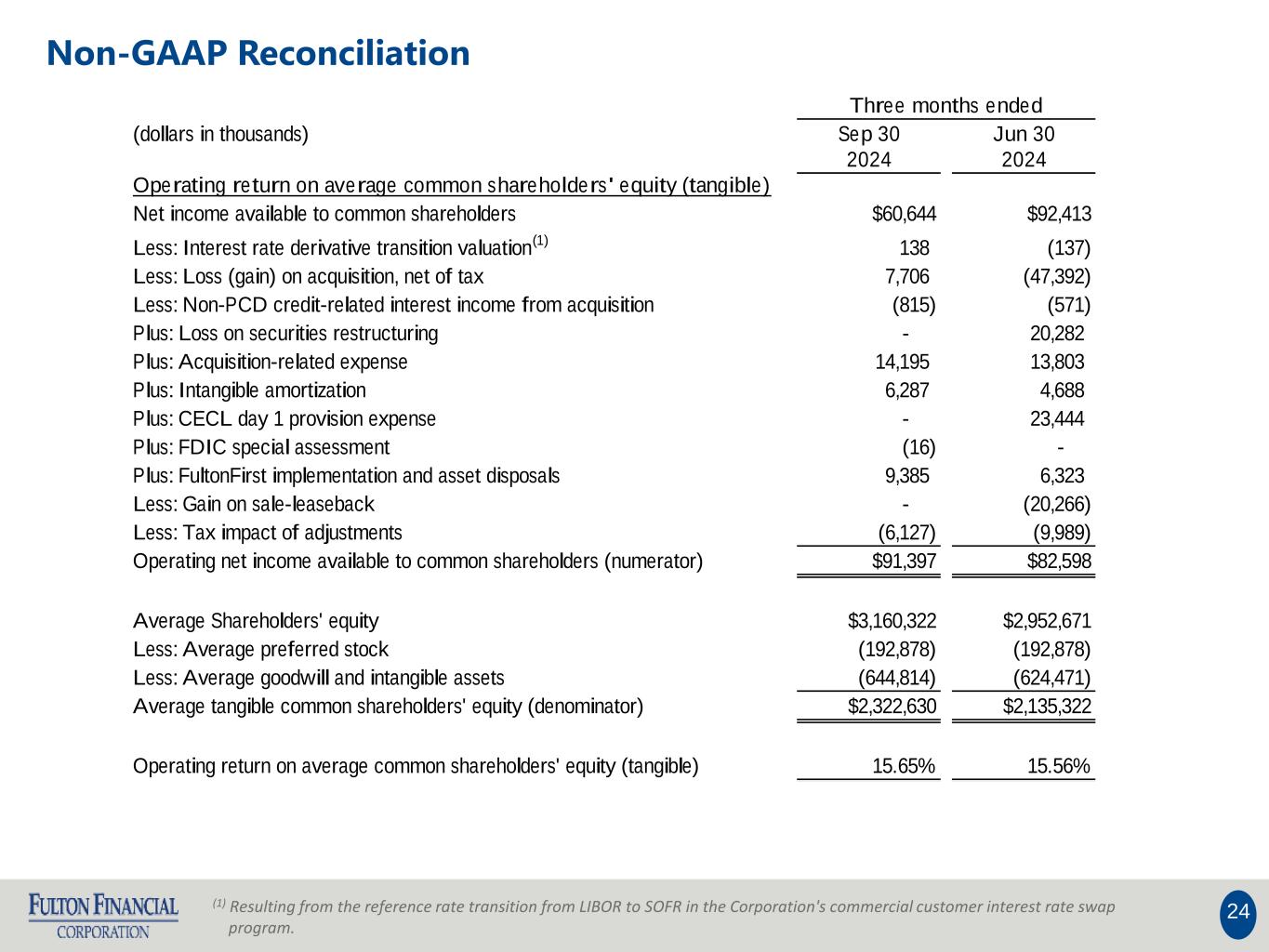 23 (1) Resulting from the reference rate transition from LIBOR to SOFR in the Corporation's commercial customer interest rate swap program. Non-GAAP Reconciliation Three months ended (dollars in thousands) Sep 30 Jun 30 2024 2024 Pre-provision net revenue / average assets Plus: Net interest income $258,009 $241,720 Plus: Non-interest income 59,673 92,994 Less: Non-interest expense (226,089) (199,488) Less: Non-PCD credit-related interest income from acquisition (815) (571) Less: Interest rate derivative transition valuation (1) 138 (137) Less: Loss (gain) on acquisition, net of tax 7,706 (47,392) Plus: Loss on securities restructuring - 20,282 Plus: Core deposit intangible amortization 6,155 4,556 Plus: Acquisition-related expense 14,195 13,803 Less: Gain on sale-leaseback - (20,266) Plus: FDIC special assessment (16) - Plus: FultonFirst implementation and asset disposals 9,385 6,323 Pre-provision net revenue (numerator) $128,341 $111,824 Total average assets $31,895,235 $30,774,891 Less: Average net core deposit intangible (89,350) (68,234) Average assets (denominator) $31,805,885 $30,706,657 Pre-provision net revenue / average assets (annualized) 1.61% 1.46%
