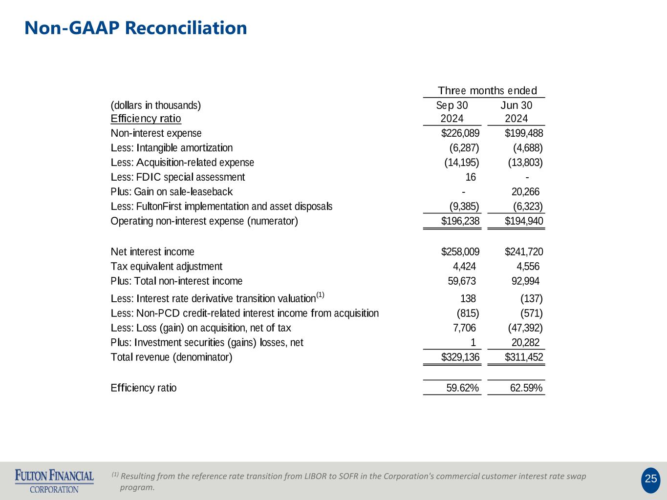 24 (1) Resulting from the reference rate transition from LIBOR to SOFR in the Corporation's commercial customer interest rate swap program. Non-GAAP Reconciliation (dollars in thousands) Sep 30 Jun 30 2024 2024 Operating return on average common shareholders' equity (tangible) Net income available to common shareholders $60,644 $92,413 Less: Interest rate derivative transition valuation (1) 138 (137) Less: Loss (gain) on acquisition, net of tax 7,706 (47,392) Less: Non-PCD credit-related interest income from acquisition (815) (571) Plus: Loss on securities restructuring - 20,282 Plus: Acquisition-related expense 14,195 13,803 Plus: Intangible amortization 6,287 4,688 Plus: CECL day 1 provision expense - 23,444 Plus: FDIC special assessment (16) - Plus: FultonFirst implementation and asset disposals 9,385 6,323 Less: Gain on sale-leaseback - (20,266) Less: Tax impact of adjustments (6,127) (9,989) Operating net income available to common shareholders (numerator) $91,397 $82,598 Average Shareholders' equity $3,160,322 $2,952,671 Less: Average preferred stock (192,878) (192,878) Less: Average goodwill and intangible assets (644,814) (624,471) Average tangible common shareholders' equity (denominator) $2,322,630 $2,135,322 Operating return on average common shareholders' equity (tangible) 15.65% 15.56% Three months ended