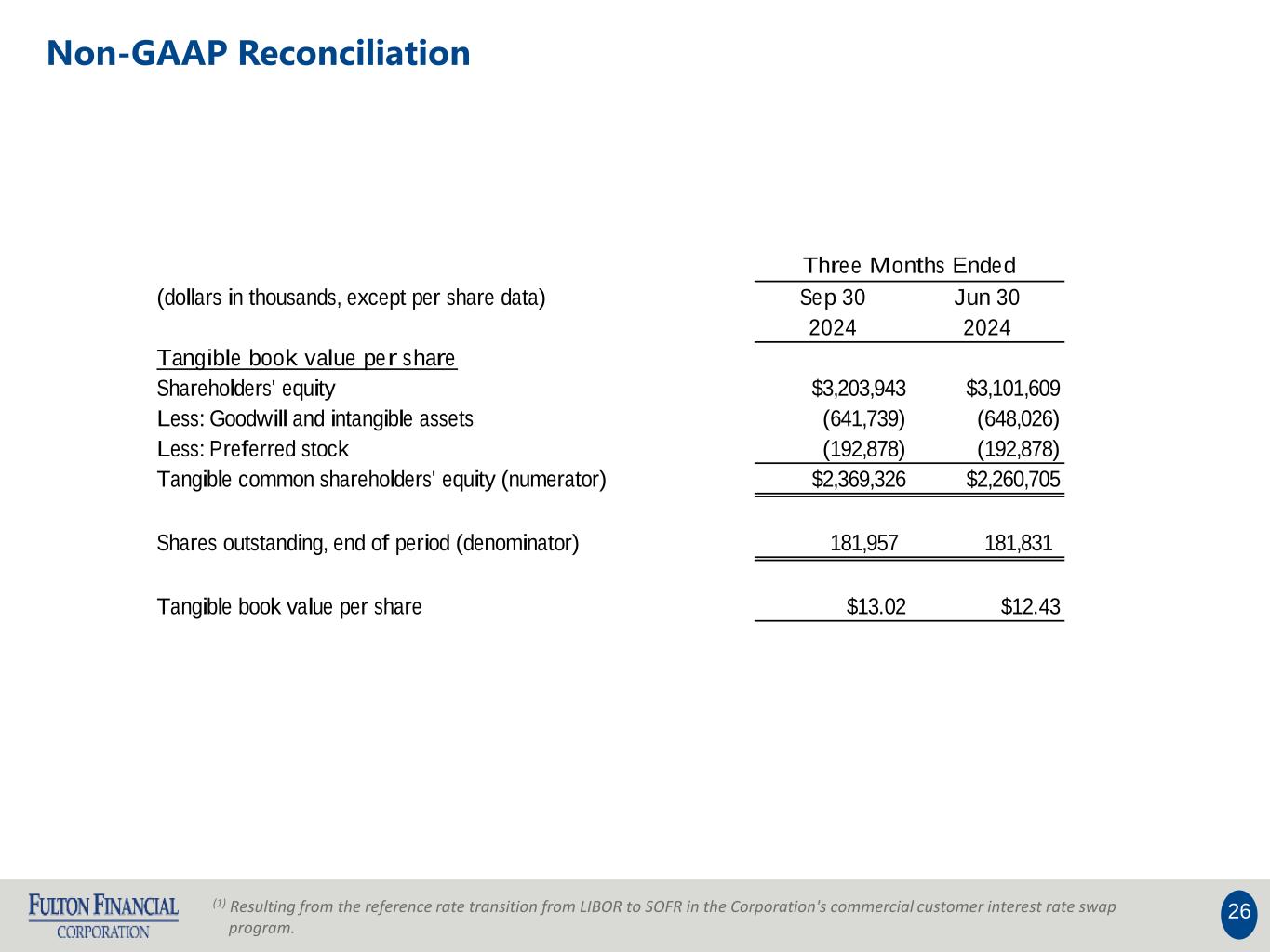 25 (1) Resulting from the reference rate transition from LIBOR to SOFR in the Corporation's commercial customer interest rate swap program. Non-GAAP Reconciliation Three months ended (dollars in thousands) Sep 30 Jun 30 Efficiency ratio 2024 2024 Non-interest expense $226,089 $199,488 Less: Intangible amortization (6,287) (4,688) Less: Acquisition-related expense (14,195) (13,803) Less: FDIC special assessment 16 - Plus: Gain on sale-leaseback - 20,266 Less: FultonFirst implementation and asset disposals (9,385) (6,323) Operating non-interest expense (numerator) $196,238 $194,940 Net interest income $258,009 $241,720 Tax equivalent adjustment 4,424 4,556 Plus: Total non-interest income 59,673 92,994 Less: Interest rate derivative transition valuation (1) 138 (137) Less: Non-PCD credit-related interest income from acquisition (815) (571) Less: Loss (gain) on acquisition, net of tax 7,706 (47,392) Plus: Investment securities (gains) losses, net 1 20,282 Total revenue (denominator) $329,136 $311,452 Efficiency ratio 59.62% 62.59%