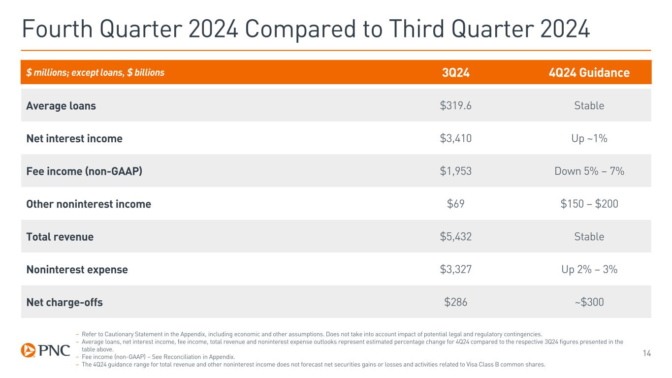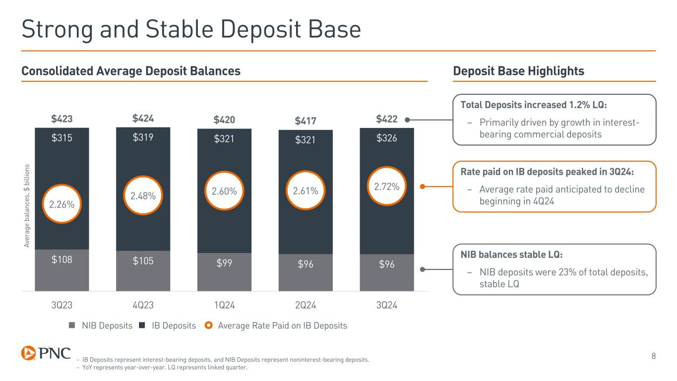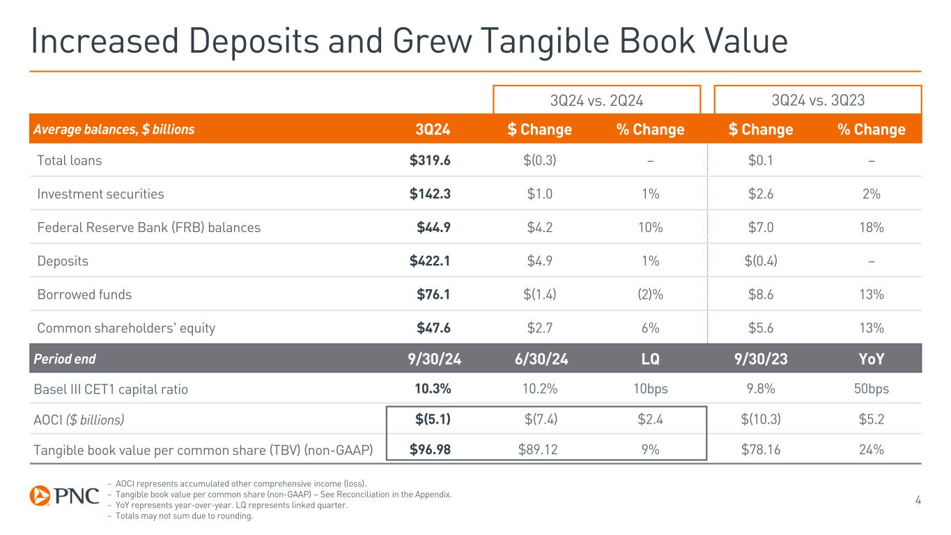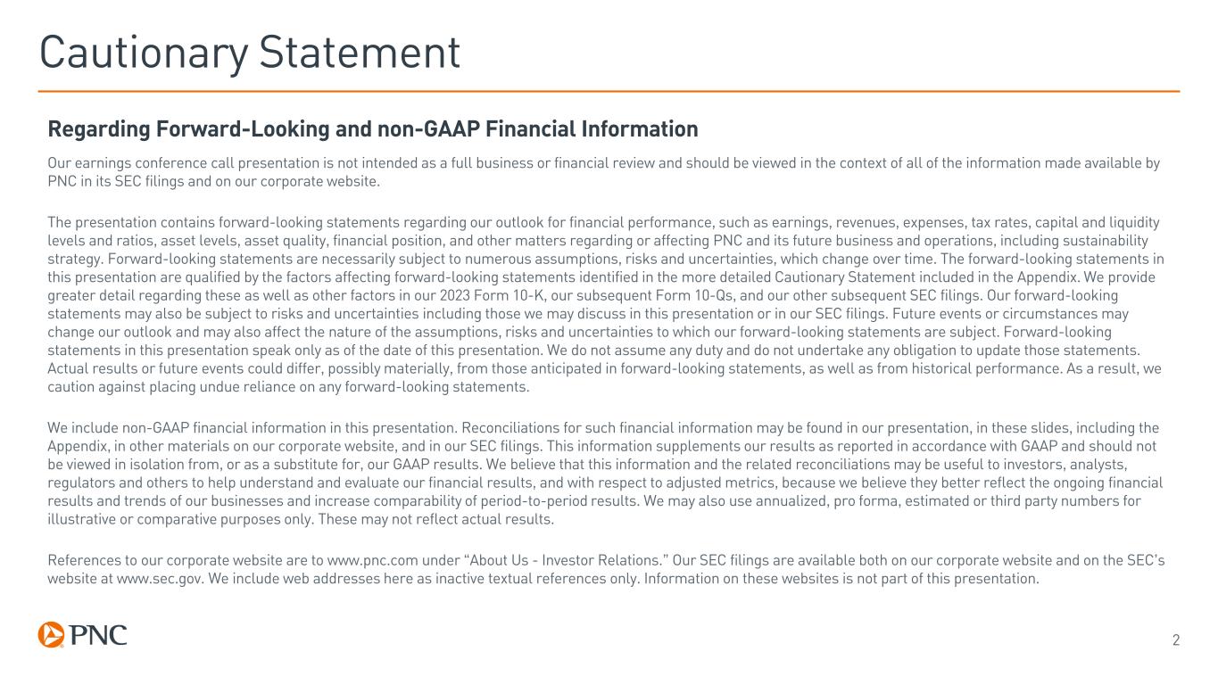 Regarding Forward-Looking and non-GAAP Financial Information Our earnings conference call presentation is not intended as a full business or financial review and should be viewed in the context of all of the information made available by PNC in its SEC filings and on our corporate website. The presentation contains forward-looking statements regarding our outlook for financial performance, such as earnings, revenues, expenses, tax rates, capital and liquidity levels and ratios, asset levels, asset quality, financial position, and other matters regarding or affecting PNC and its future business and operations, including sustainability strategy. Forward-looking statements are necessarily subject to numerous assumptions, risks and uncertainties, which change over time. The forward-looking statements in this presentation are qualified by the factors affecting forward-looking statements identified in the more detailed Cautionary Statement included in the Appendix. We provide greater detail regarding these as well as other factors in our 2023 Form 10-K, our subsequent Form 10-Qs, and our other subsequent SEC filings. Our forward-looking statements may also be subject to risks and uncertainties including those we may discuss in this presentation or in our SEC filings. Future events or circumstances may change our outlook and may also affect the nature of the assumptions, risks and uncertainties to which our forward-looking statements are subject. Forward-looking statements in this presentation speak only as of the date of this presentation. We do not assume any duty and do not undertake any obligation to update those statements. Actual results or future events could differ, possibly materially, from those anticipated in forward-looking statements, as well as from historical performance. As a result, we caution against placing undue reliance on any forward-looking statements. We include non-GAAP financial information in this presentation. Reconciliations for such financial information may be found in our presentation, in these slides, including the Appendix, in other materials on our corporate website, and in our SEC filings. This information supplements our results as reported in accordance with GAAP and should not be viewed in isolation from, or as a substitute for, our GAAP results. We believe that this information and the related reconciliations may be useful to investors, analysts, regulators and others to help understand and evaluate our financial results, and with respect to adjusted metrics, because we believe they better reflect the ongoing financial results and trends of our businesses and increase comparability of period-to-period results. We may also use annualized, pro forma, estimated or third party numbers for illustrative or comparative purposes only. These may not reflect actual results. References to our corporate website are to www.pnc.com under “About Us - Investor Relations.” Our SEC filings are available both on our corporate website and on the SEC’s website at www.sec.gov. We include web addresses here as inactive textual references only. Information on these websites is not part of this presentation. 2 Cautionary Statement