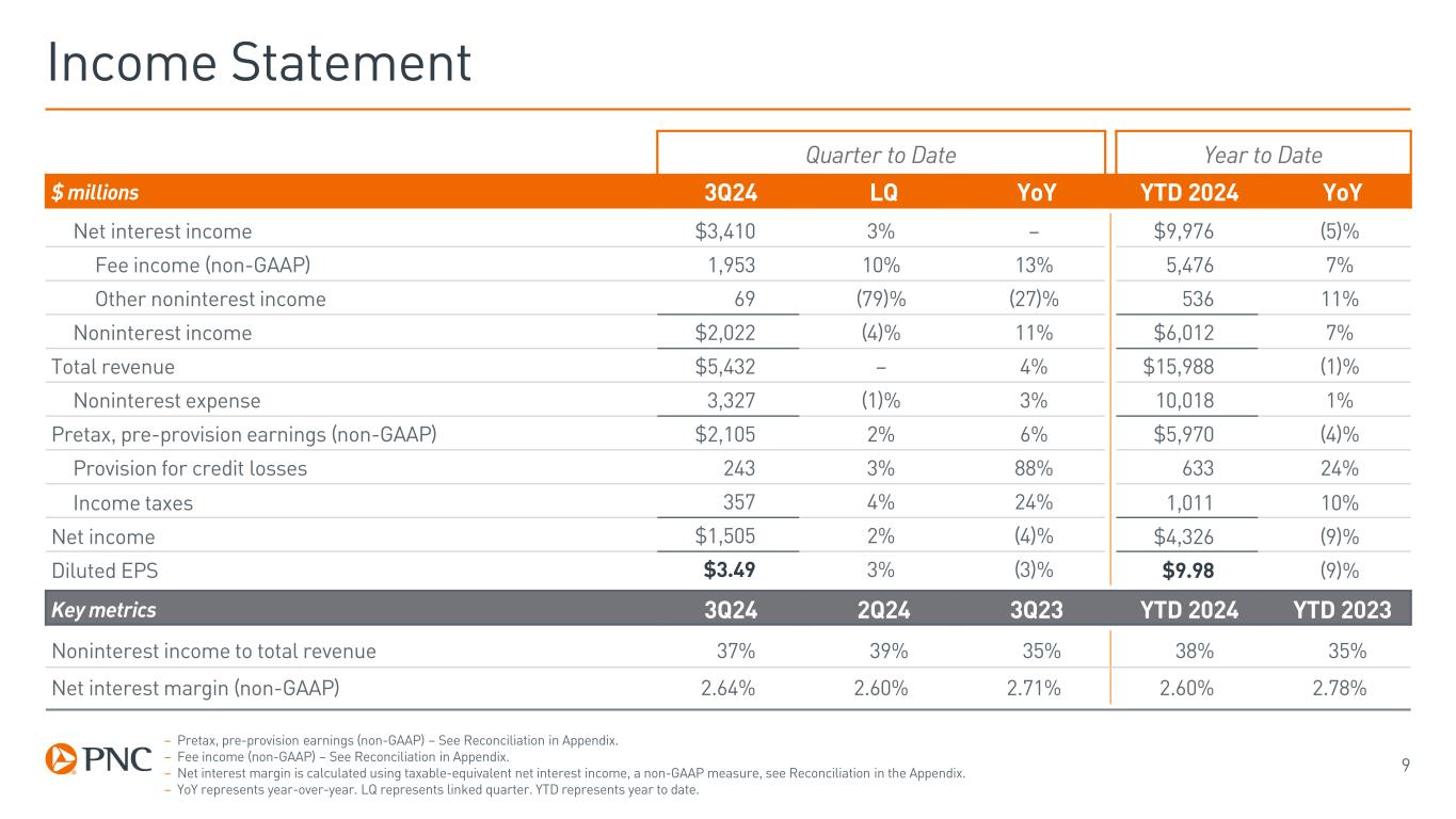 Appendix: Non-GAAP to GAAP Reconciliation 23 We believe that pretax, pre-provision earnings is a useful tool to help evaluate the ability to provide for credit costs through operations and provides an additional basis to compare results between periods by isolating the impact of provision for (recapture of) credit losses, which can vary significantly between periods. Pretax, Pre-Provision Earnings (non-GAAP) For the three months ended For the nine months ended $ millions Sep. 30, 2024 Jun. 30, 2024 Sep. 30, 2023 Sep. 30, 2024 Sep. 30, 2023 Total revenue $5,432 $5,411 $5,233 $15,988 $16,129 Total noninterest expense 3,327 3,357 3,245 10,018 9,938 Pretax, pre-provision earnings (non-GAAP) $2,105 $2,054 $1,988 $5,970 $6,191