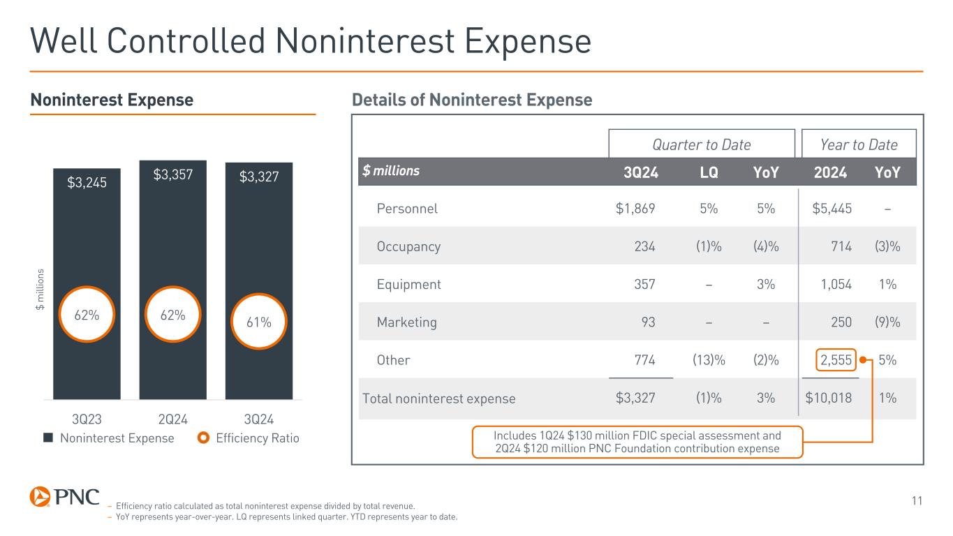 10 LQ Revenue Growth Driven By Higher Fee Income and NII $3,418 $3,302 $3,410 $1,815 $2,109 $2,022 $5,233 $5,411 $5,432 2.71% 2.60% 2.64% 3Q23 2Q24 3Q24 Net Interest Margin Net Interest Income Noninterest Income Details of Revenue Quarter to Date Year to Date $ millions 3Q24 LQ YoY 2024 YoY Net interest income $3,410 3% – $9,976 (5)% Asset management and brokerage 383 5% 10% 1,111 6% Capital markets and advisory 371 36% 121% 902 40% Card and cash management 698 (1)% 1% 2,075 1% Lending and deposit services 320 5% 2% 929 1% Residential and commercial mortgage 181 38% (10)% 459 (4)% Fee income (non-GAAP) $1,953 10% 13% $5,476 7% Other noninterest income 69 (79)% (27)% 536 11% Noninterest income $2,022 (4)% 11% $6,012 7% Total revenue $5,432 – 4% $15,988 (1)% Total Revenue $ m ill io ns – Fee income (non-GAAP) – See Reconciliation in Appendix. – 2Q24 significant items represents the pretax net impact of the Visa Gain of $754 million, securities losses of $(497) million, and Visa derivative fair value adjustments of $(116) million. – NII represents net interest income. – YoY represents year-over-year. LQ represents linked quarter. YTD represents year to date. Includes $141 million of significant items Includes $(128) million Visa derivative