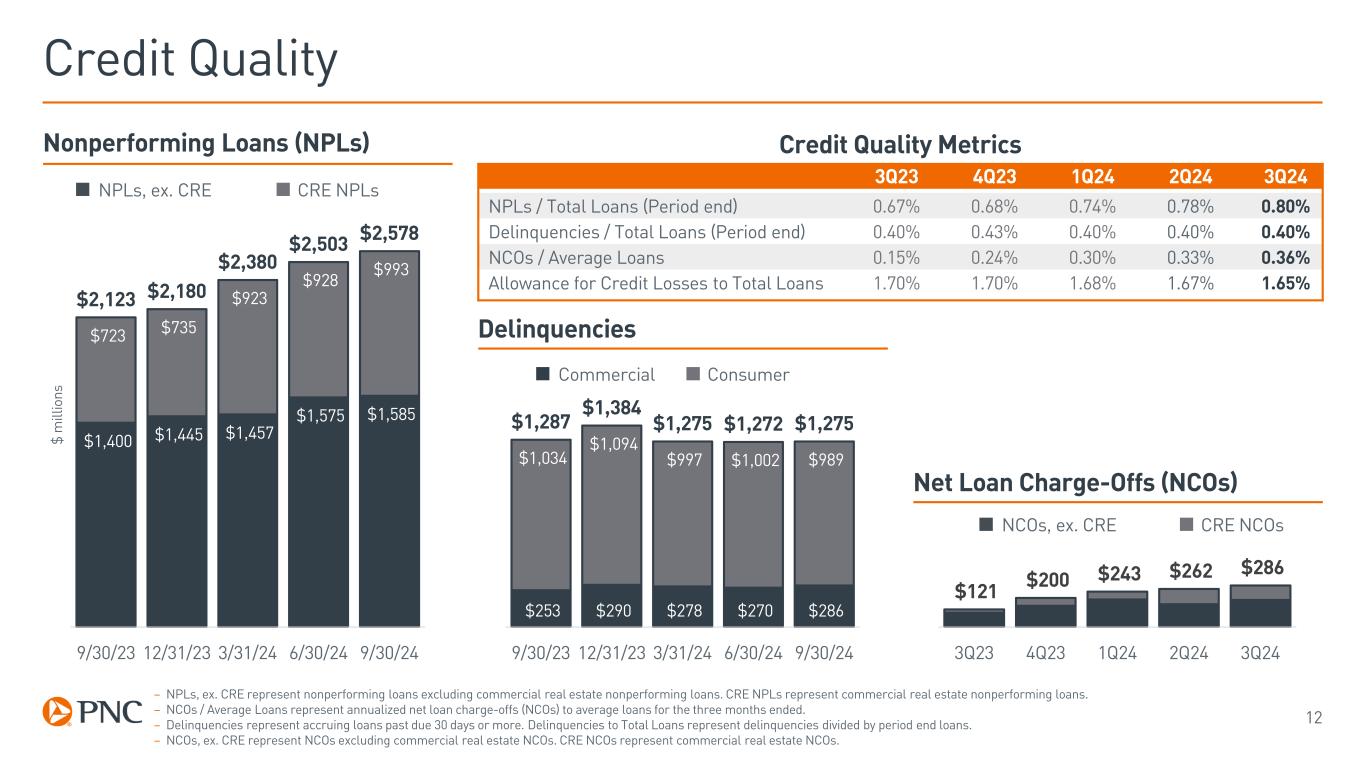 $3,245 $3,357 $3,327 62% 62% 61% 3Q23 2Q24 3Q24 11 Well Controlled Noninterest Expense Noninterest Expense Details of Noninterest Expense Quarter to Date Year to Date $ millions 3Q24 LQ YoY 2024 YoY Personnel $1,869 5% 5% $5,445 – Occupancy 234 (1)% (4)% 714 (3)% Equipment 357 – 3% 1,054 1% Marketing 93 – – 250 (9)% Other 774 (13)% (2)% 2,555 5% Total noninterest expense $3,327 (1)% 3% $10,018 1% $ m ill io ns Noninterest Expense Efficiency Ratio – Efficiency ratio calculated as total noninterest expense divided by total revenue. – YoY represents year-over-year. LQ represents linked quarter. YTD represents year to date. Includes 1Q24 $130 million FDIC special assessment and 2Q24 $120 million PNC Foundation contribution expense