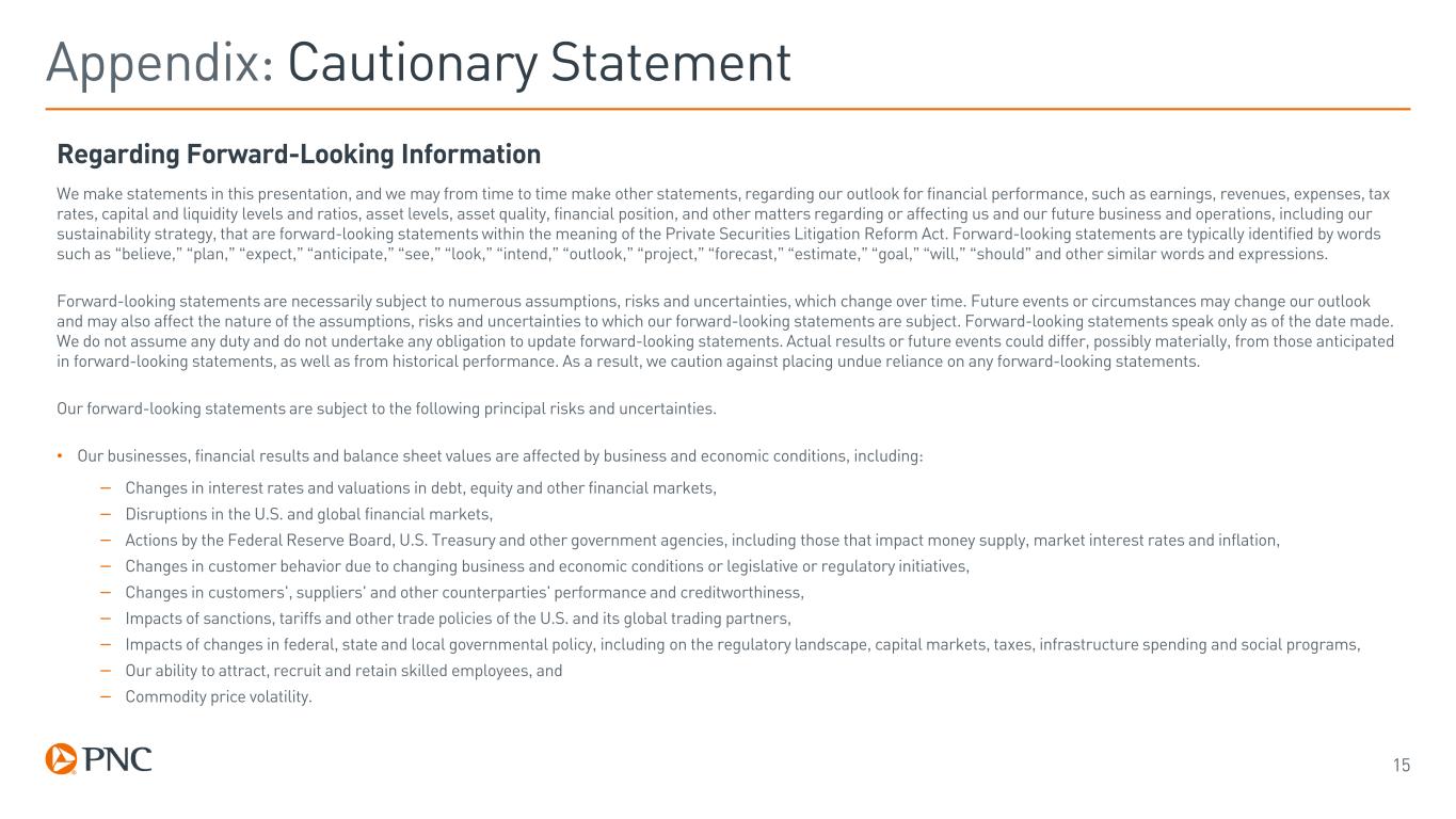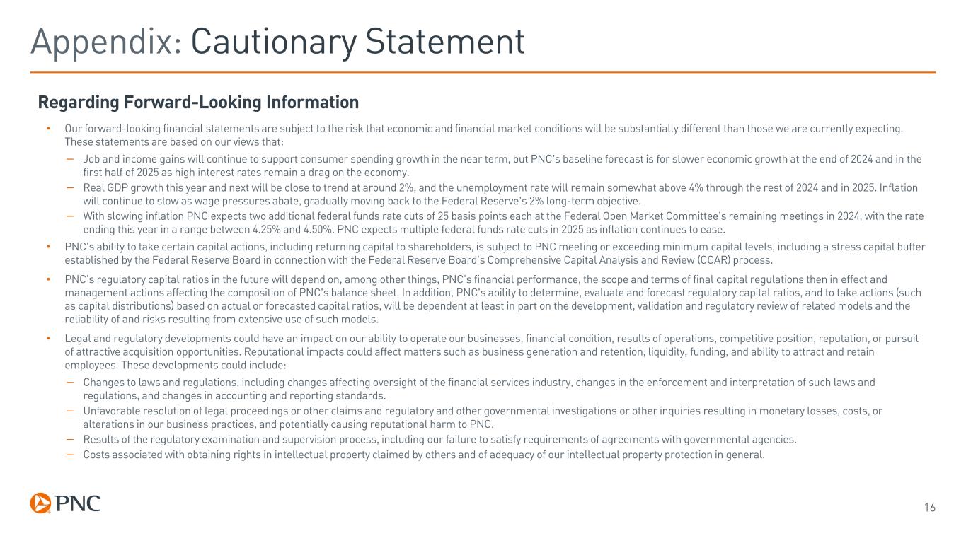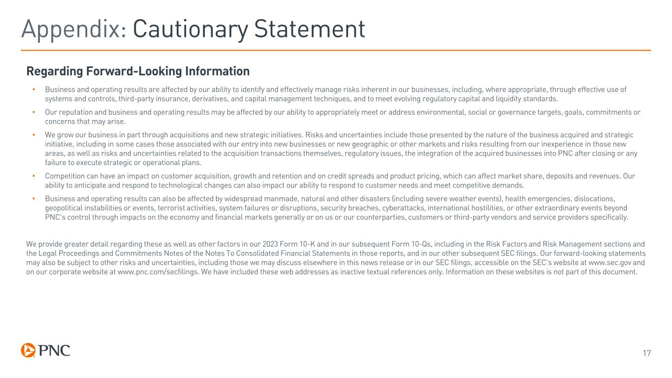 Appendix: Cautionary Statement 16 Regarding Forward-Looking Information • Our forward-looking financial statements are subject to the risk that economic and financial market conditions will be substantially different than those we are currently expecting. These statements are based on our views that: − Job and income gains will continue to support consumer spending growth in the near term, but PNC’s baseline forecast is for slower economic growth at the end of 2024 and in the first half of 2025 as high interest rates remain a drag on the economy. − Real GDP growth this year and next will be close to trend at around 2%, and the unemployment rate will remain somewhat above 4% through the rest of 2024 and in 2025. Inflation will continue to slow as wage pressures abate, gradually moving back to the Federal Reserve’s 2% long-term objective. − With slowing inflation PNC expects two additional federal funds rate cuts of 25 basis points each at the Federal Open Market Committee’s remaining meetings in 2024, with the rate ending this year in a range between 4.25% and 4.50%. PNC expects multiple federal funds rate cuts in 2025 as inflation continues to ease. • PNC's ability to take certain capital actions, including returning capital to shareholders, is subject to PNC meeting or exceeding minimum capital levels, including a stress capital buffer established by the Federal Reserve Board in connection with the Federal Reserve Board's Comprehensive Capital Analysis and Review (CCAR) process. • PNC's regulatory capital ratios in the future will depend on, among other things, PNC's financial performance, the scope and terms of final capital regulations then in effect and management actions affecting the composition of PNC's balance sheet. In addition, PNC's ability to determine, evaluate and forecast regulatory capital ratios, and to take actions (such as capital distributions) based on actual or forecasted capital ratios, will be dependent at least in part on the development, validation and regulatory review of related models and the reliability of and risks resulting from extensive use of such models. • Legal and regulatory developments could have an impact on our ability to operate our businesses, financial condition, results of operations, competitive position, reputation, or pursuit of attractive acquisition opportunities. Reputational impacts could affect matters such as business generation and retention, liquidity, funding, and ability to attract and retain employees. These developments could include: − Changes to laws and regulations, including changes affecting oversight of the financial services industry, changes in the enforcement and interpretation of such laws and regulations, and changes in accounting and reporting standards. − Unfavorable resolution of legal proceedings or other claims and regulatory and other governmental investigations or other inquiries resulting in monetary losses, costs, or alterations in our business practices, and potentially causing reputational harm to PNC. − Results of the regulatory examination and supervision process, including our failure to satisfy requirements of agreements with governmental agencies. − Costs associated with obtaining rights in intellectual property claimed by others and of adequacy of our intellectual property protection in general.