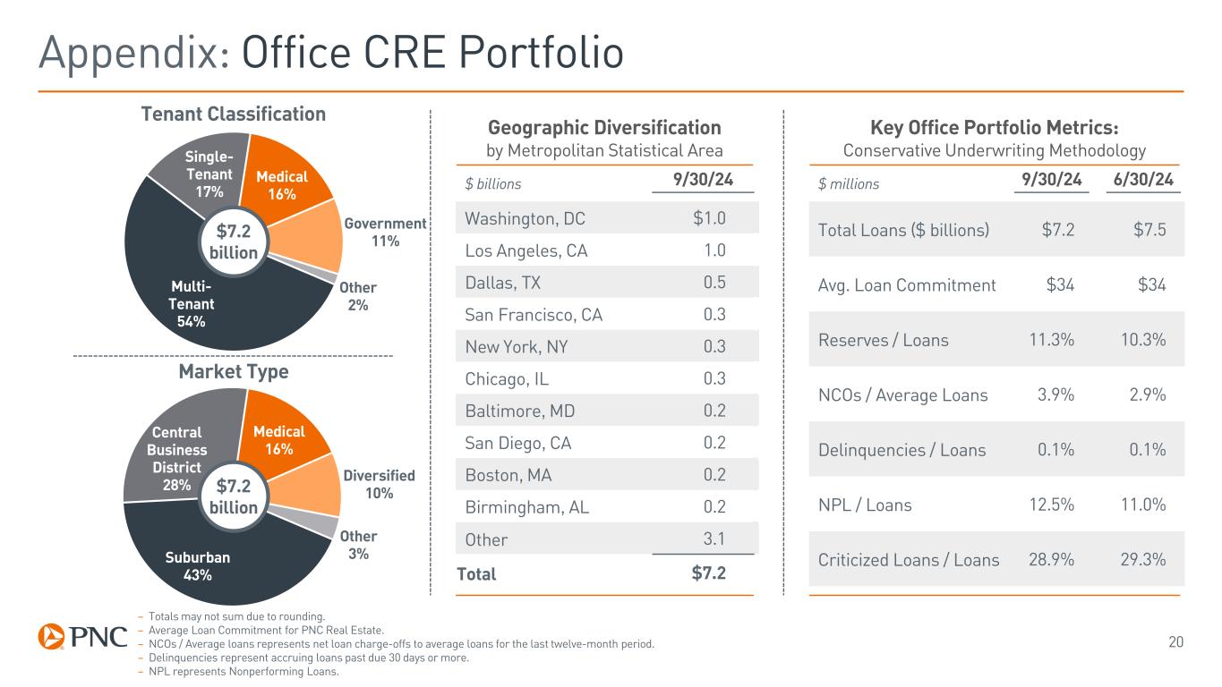 Appendix: Multifamily CRE Portfolio 19 Garden 48% Midrise 32% High Rise 9% Student 5% Other 6% CRE Multifamily Loans as of 9/30/24 Total $16.7 Billion – Average Loan Commitment for PNC Real Estate. – NCOs / Average loans represents net loan charge-offs to average loans for the last twelve-month period. – Delinquencies represent accruing loans past due 30 days or more. – NPL represents Nonperforming Loans. Key Multifamily Portfolio Metrics: Conservative Underwriting Methodology $ millions 9/30/24 6/30/24 Total Loans ($ billions) $16.7 $16.5 Avg. Loan Commitment $30 $30 Reserves / Loans 2.8% 2.8% NCOs / Average Loans 0.0% 0.0% Delinquencies / Loans 0.0% 0.0% NPL / Loans 0.3% 0.3% Criticized Loans / Loans 15.4% 13.7% Geographic Diversification by Metropolitan Statistical Area $ billions 9/30/24 Miami, FL $1.2 Phoenix, AZ 0.9 Washington, DC 0.9 Dallas, TX 0.9 New York, NY 0.8 Houston, TX 0.7 Las Vegas, NV 0.7 Los Angeles, CA 0.6 San Diego, CA 0.5 Denver, CO 0.5 Other 9.0 Total $16.7