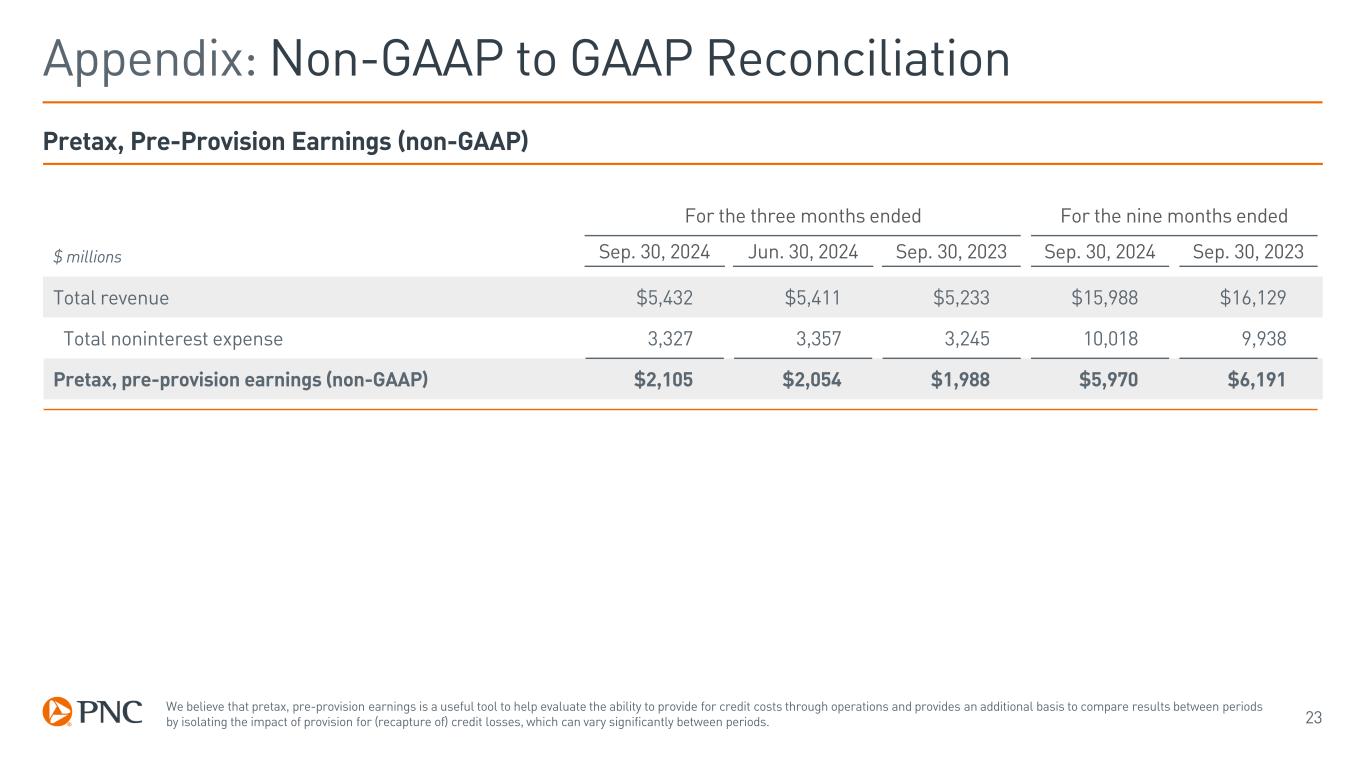 Appendix: Non-GAAP to GAAP Reconciliation 22 We believe this non-GAAP measure to be a useful tool for comparison of operating expenses incurred during the normal course of business. The exclusion of FDIC special assessment costs, workforce reduction charges and Visa shares donated to the PNC Foundation increases comparability across periods, demonstrates the impact of significant items and provides a useful measure for determining PNC’s expenses that are core to our business operations and expected to recur over time. Core Noninterest Expense (non-GAAP) For the three months ended LQ Change For the nine months ended YoY Change $ millions Sep. 30, 2024 Jun. 30, 2024 $ % Sep. 30, 2024 Sep. 30, 2023 $ % Total noninterest expense $3,327 $3,357 $(30) (1)% $10,018 $9,938 $80 1% Less non-core noninterest expense: 2Q24 PNC Foundation contribution expense 120 120 Workforce reduction charge FDIC special assessment 130 Non-core noninterest expense $120 $250 Core noninterest expense (non-GAAP) $3,327 $3,237 $90 3% $9,768 $9,938 $(170) (2)%