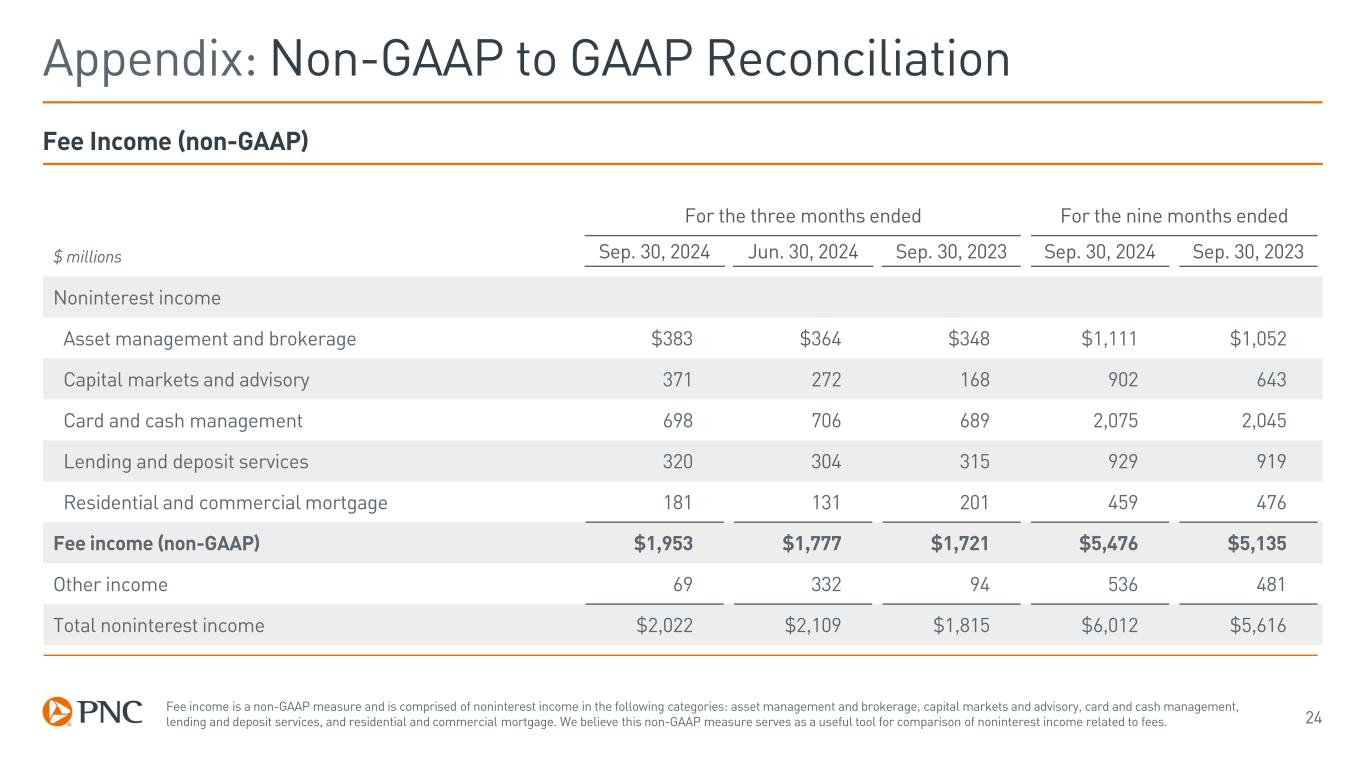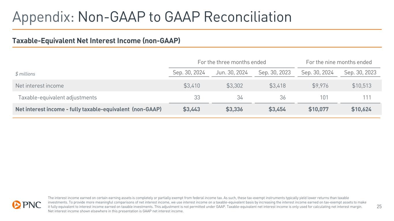Appendix: Non-GAAP to GAAP Reconciliation 24 Fee income is a non-GAAP measure and is comprised of noninterest income in the following categories: asset management and brokerage, capital markets and advisory, card and cash management, lending and deposit services, and residential and commercial mortgage. We believe this non-GAAP measure serves as a useful tool for comparison of noninterest income related to fees. Fee Income (non-GAAP) For the three months ended For the nine months ended $ millions Sep. 30, 2024 Jun. 30, 2024 Sep. 30, 2023 Sep. 30, 2024 Sep. 30, 2023 Noninterest income Asset management and brokerage $383 $364 $348 $1,111 $1,052 Capital markets and advisory 371 272 168 902 643 Card and cash management 698 706 689 2,075 2,045 Lending and deposit services 320 304 315 929 919 Residential and commercial mortgage 181 131 201 459 476 Fee income (non-GAAP) $1,953 $1,777 $1,721 $5,476 $5,135 Other income 69 332 94 536 481 Total noninterest income $2,022 $2,109 $1,815 $6,012 $5,616